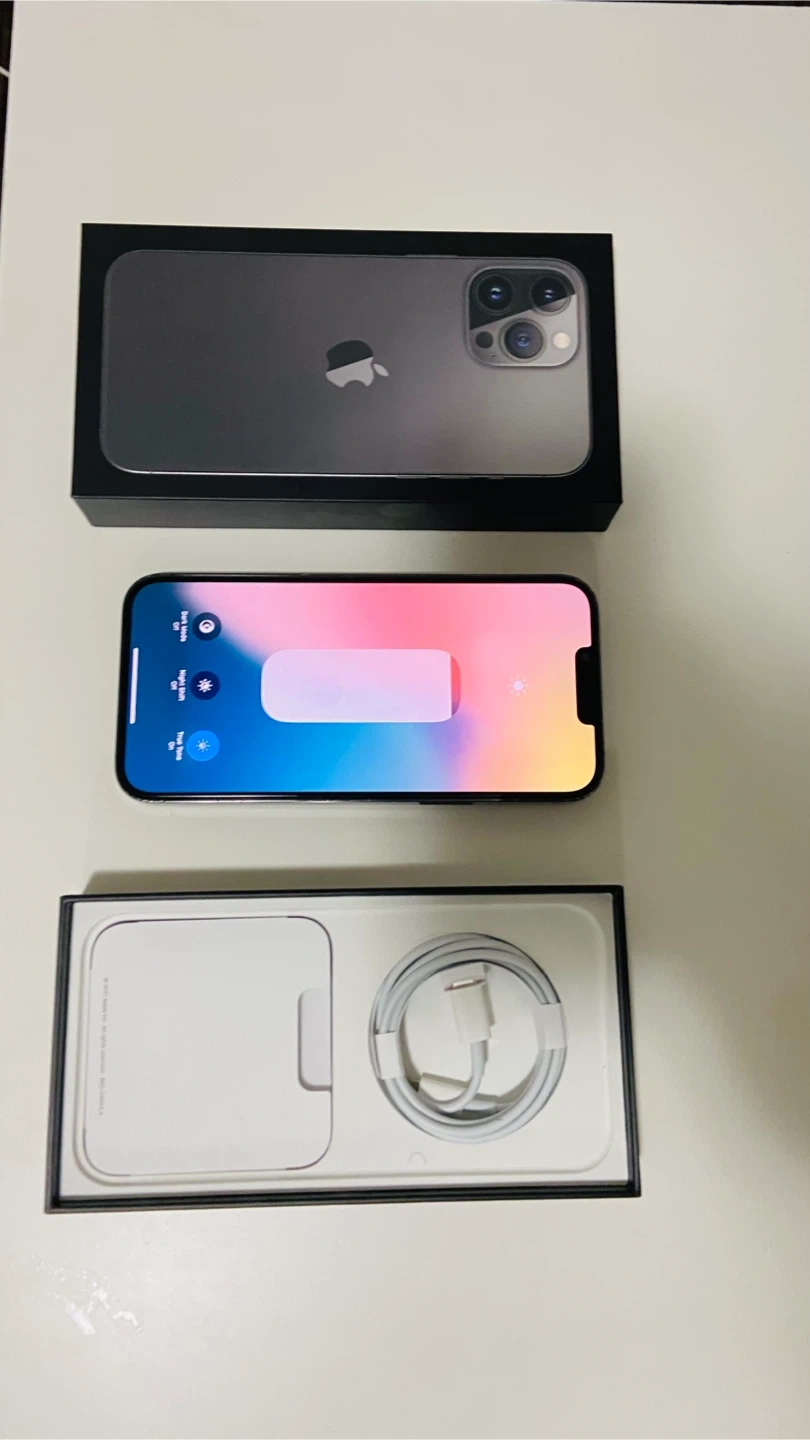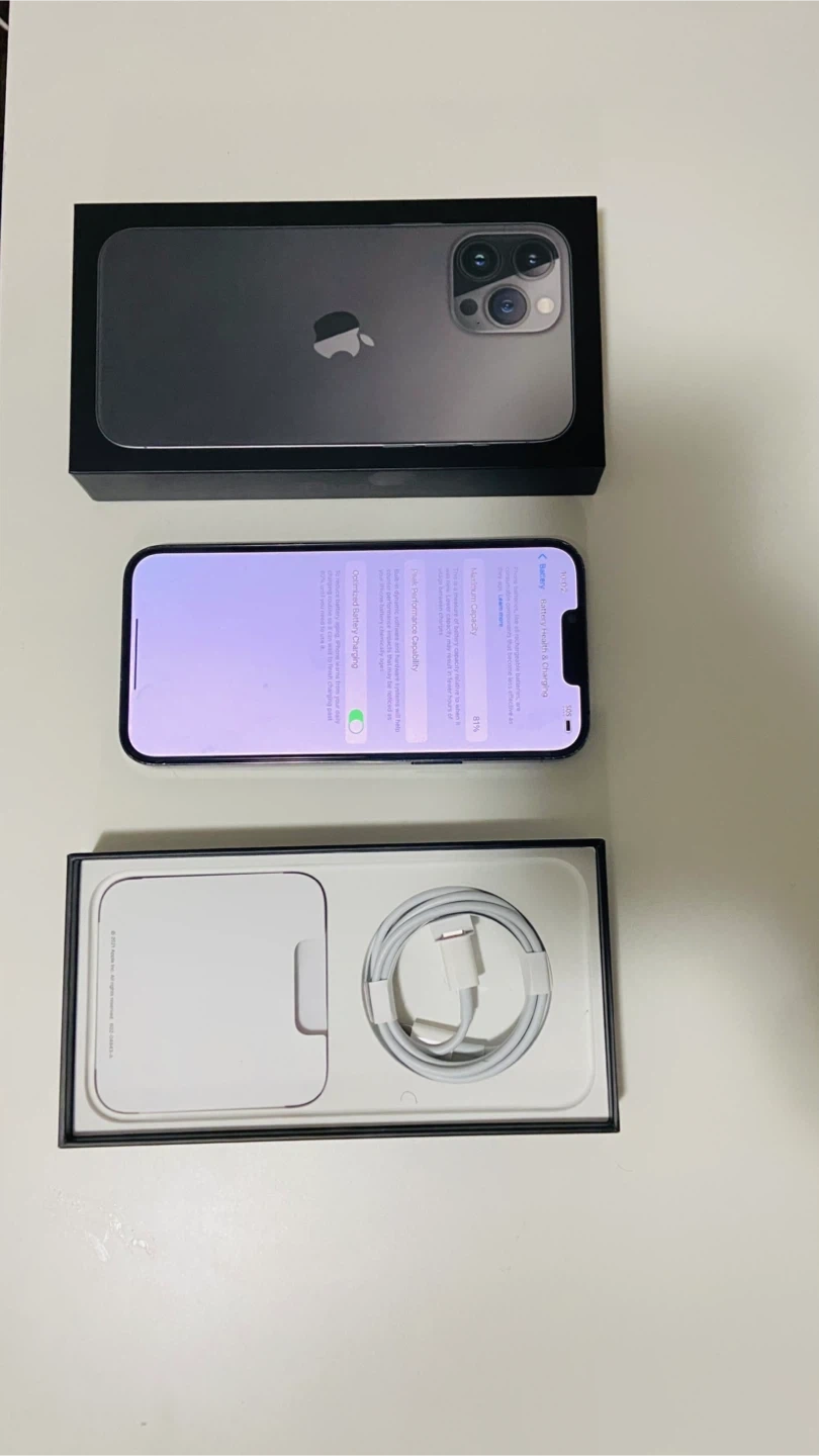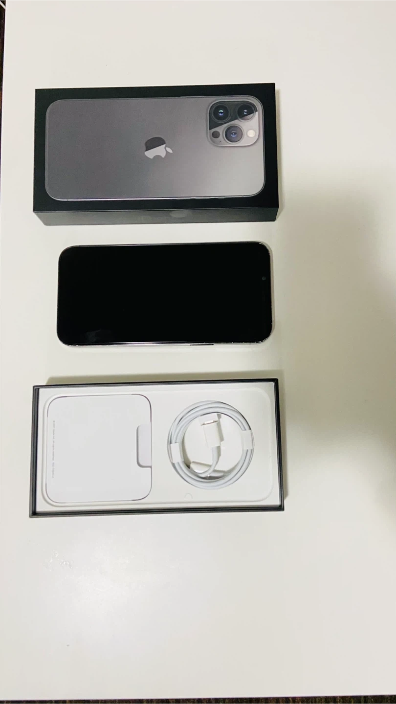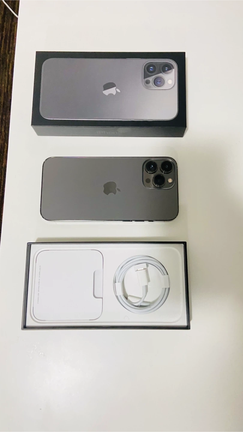 Selling an Apple iPhone 13 Pro Max in Graphite. It comes with the original box and included components like the charging cable. It's in great condition and ready for a new home!