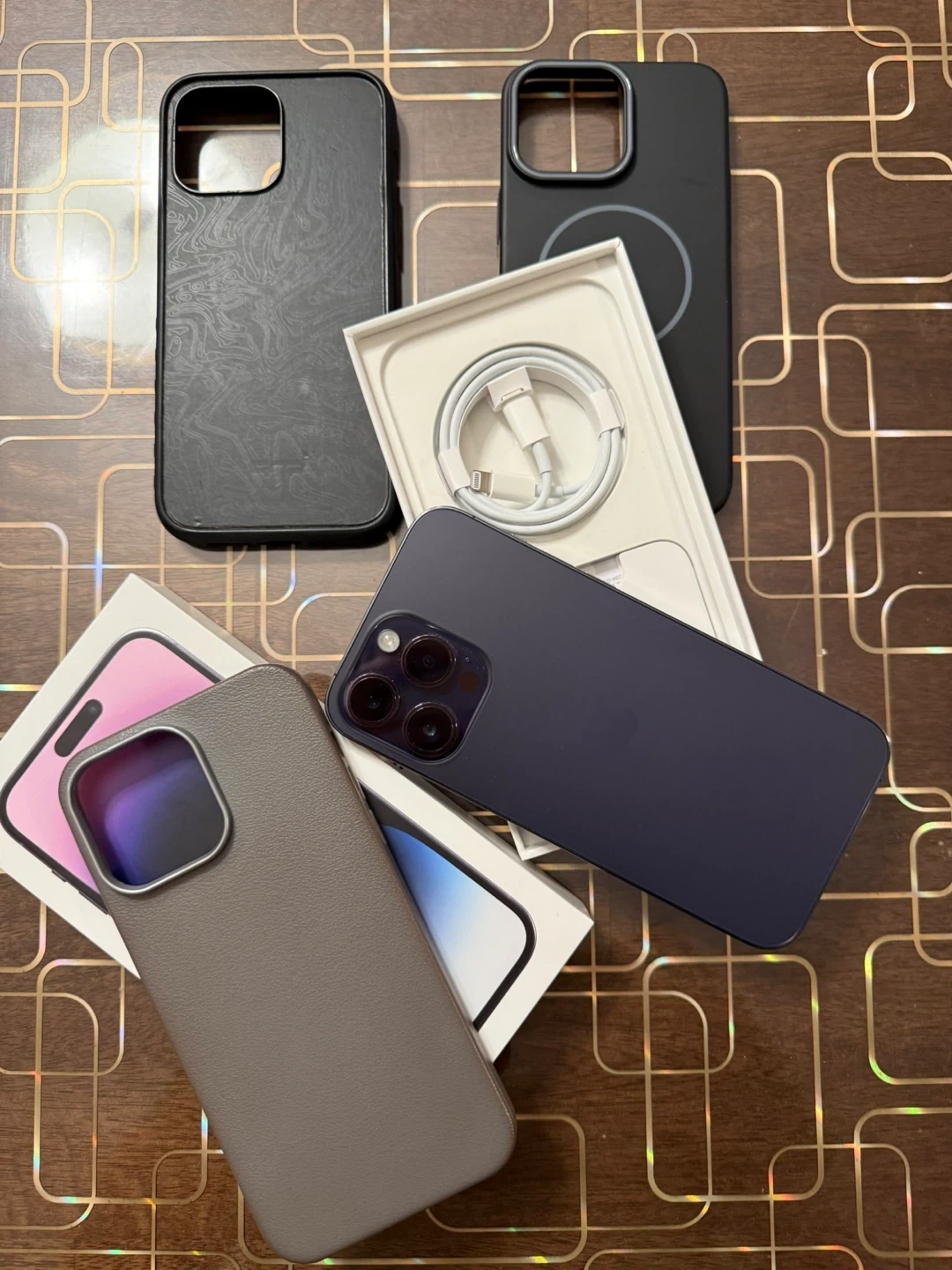 Selling an Apple iPhone 14 Pro with 256GB of storage in Deep Purple! It comes with the box and a charging cable. There are also three cases included!