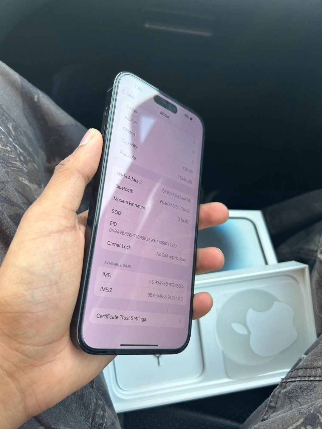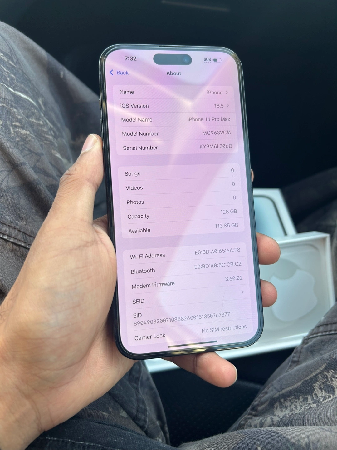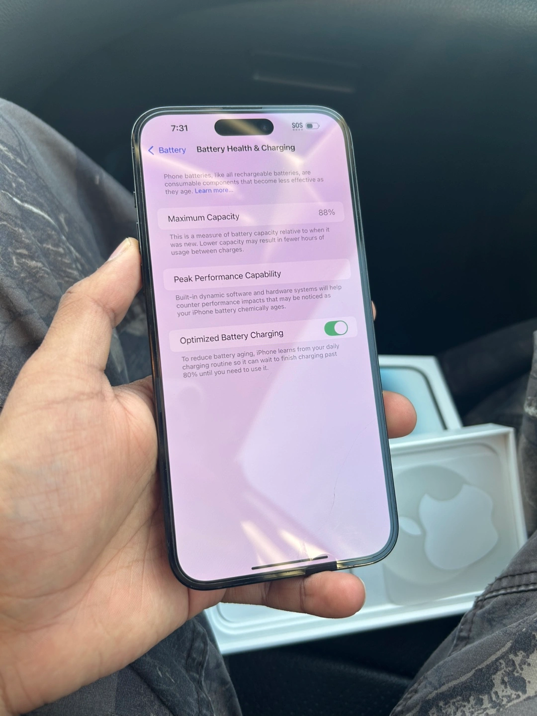 Selling an Apple iPhone 14 Pro Max with 128GB of storage. The battery health is at 88%. Comes with the original box.