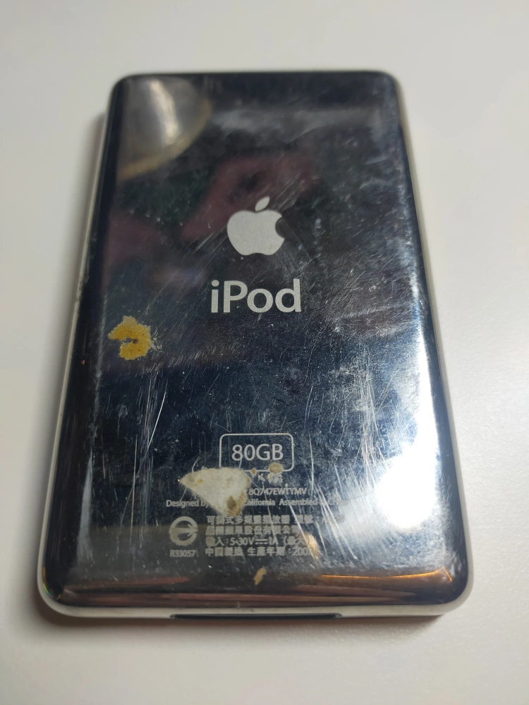 Selling an Apple iPod Classic with 80GB of storage. It has some scratches and signs of wear, but it's still functional. Perfect for anyone looking for a classic music player!