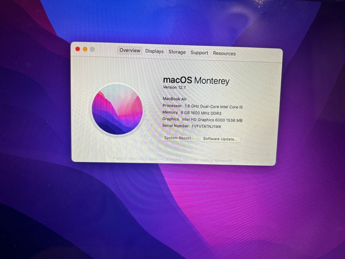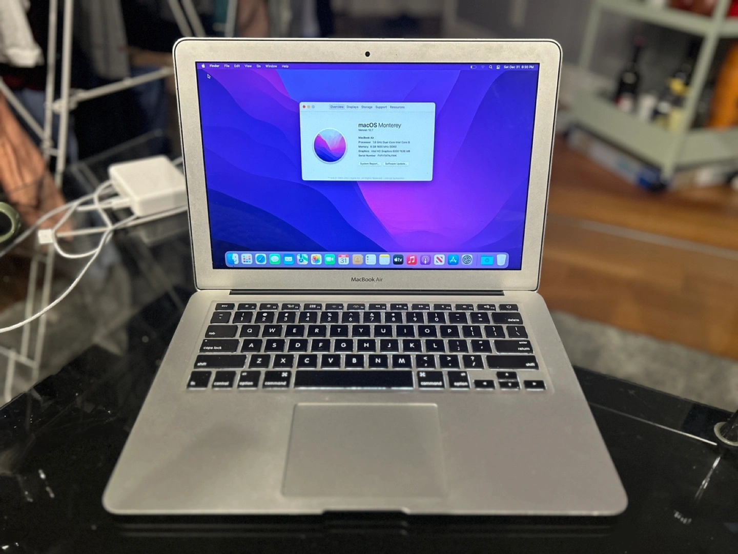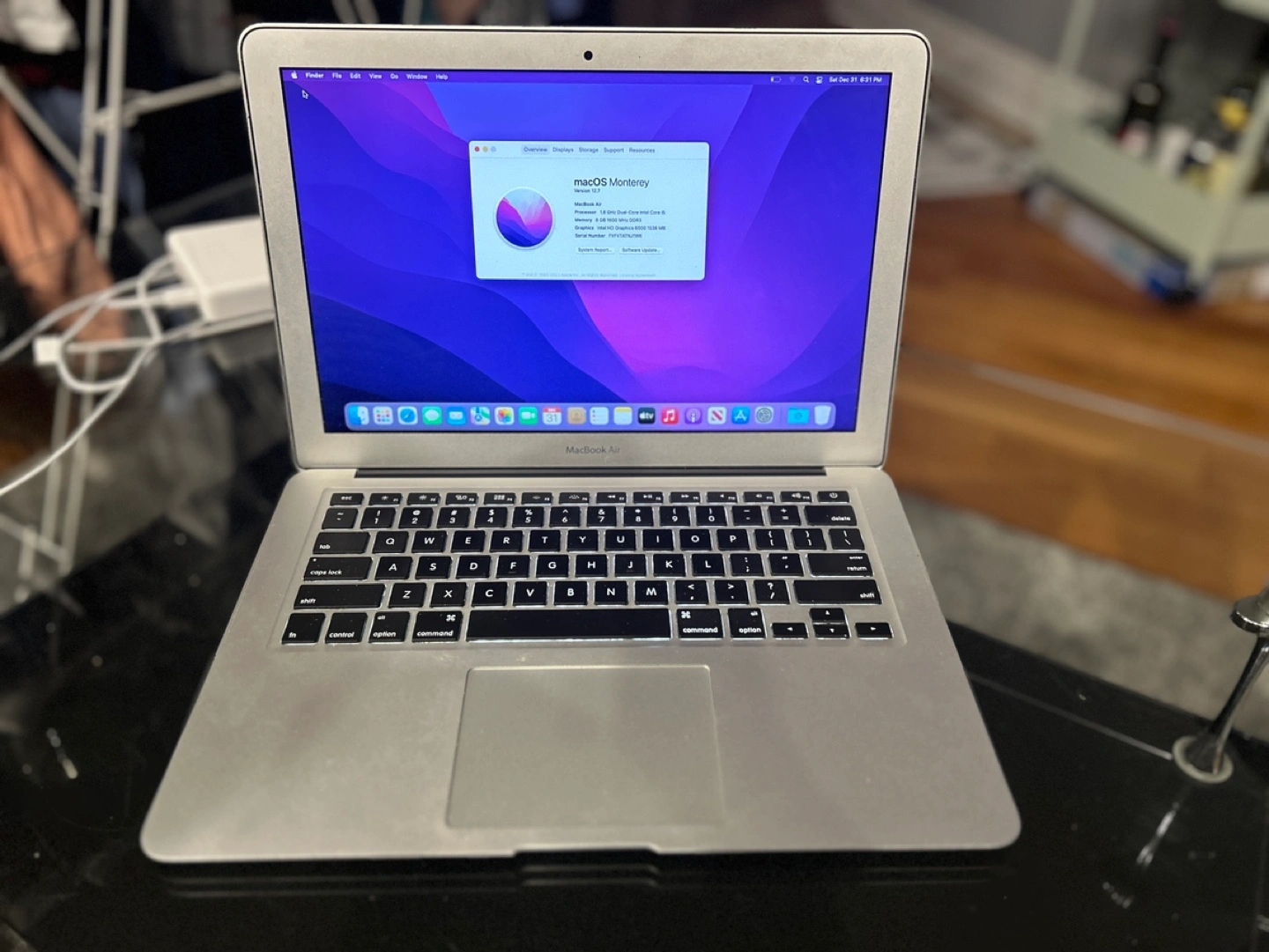 52MacBook Air 13.3-Inch laptop with 1.8 GHz Dual-Core Intel Core i5 processor, 8 GB 1600 MHz DDR3 memory, and Intel HD Graphics 6000 1536 MB graphics. Runs macOS Monterey.