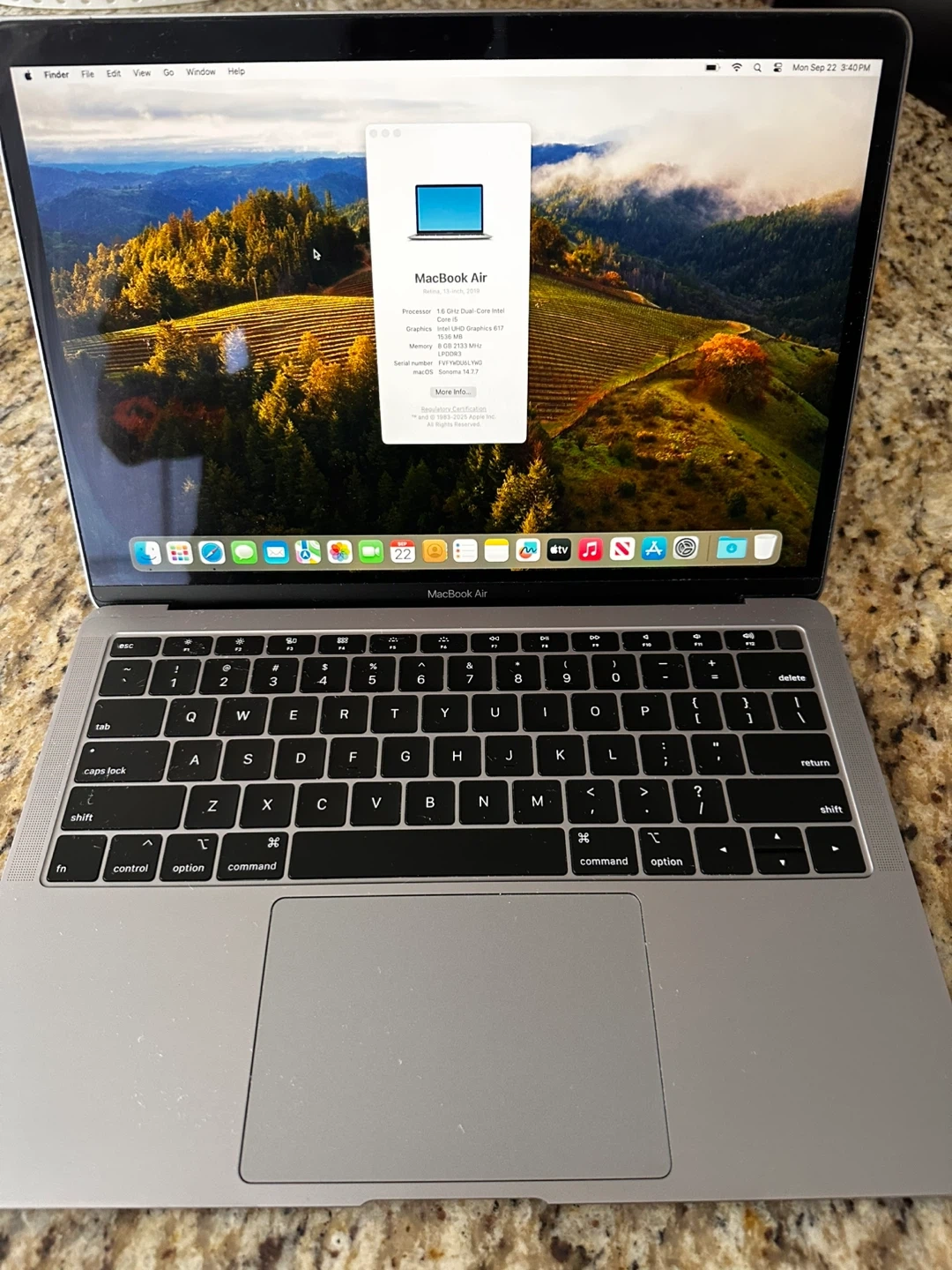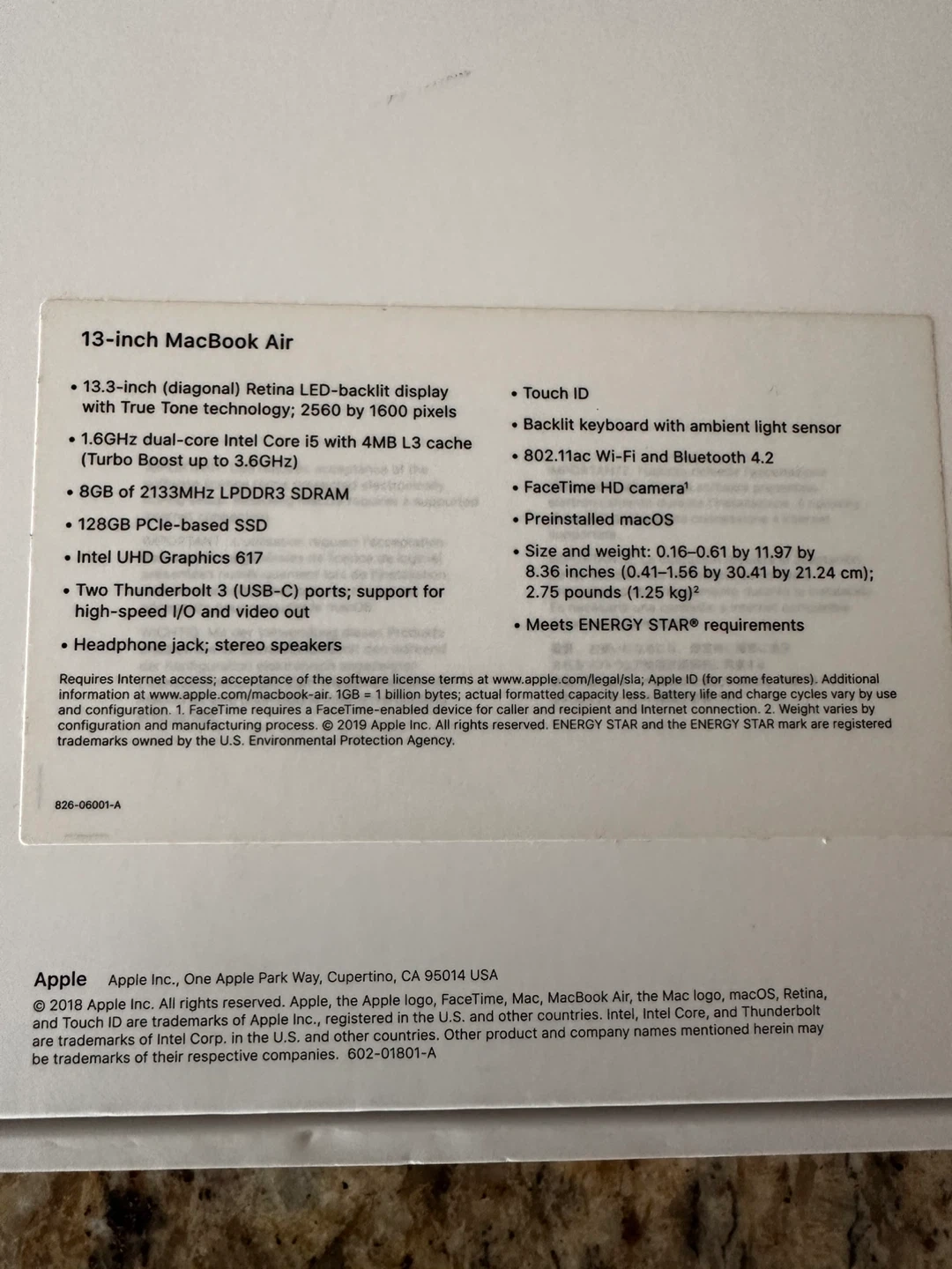71Selling a very good condition used 13-inch MacBook Air. Key features include: - 13.3-inch Retina LED-backlit display - 1.6GHz Dual-Core Intel Core i5 with 4MB L3 cache - 8GB of 2133MHz LPDDR3 SDRAM - 128GB PCIe-based SSD - Intel UHD Graphics 617 - Two Thunderbolt 3 (USB-C) ports - Headphone jack - Stereo speakers - Touch ID - Backlit keyboard with ambient light sensor - 802.11ac Wi-Fi and Bluetooth 4.2 - FaceTime HD camera - Preinstalled macOS - Size and weight: 0.16–0.61 by 11.97 by 8.36 inches (0.41–1.56 by 30.41 by 21.24 cm); 2.75 pounds (1.25 kg)