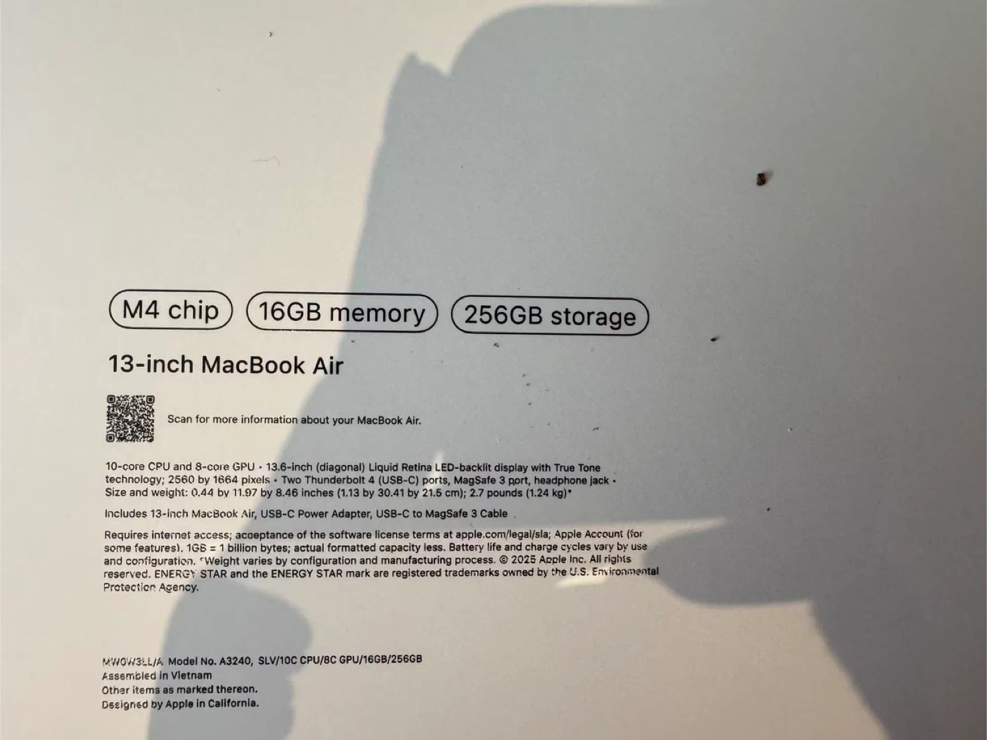 Selling a brand new, unopened 13-inch MacBook Air with the M4 chip! It has 16GB of memory and 256GB of storage. The box includes the USB-C Power Adapter and a USB-C to MagSafe 3 Cable,price firm serious buyer only