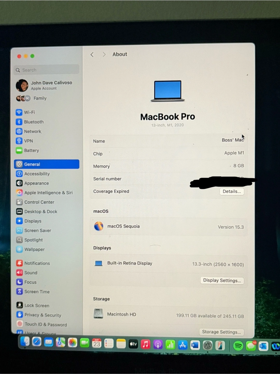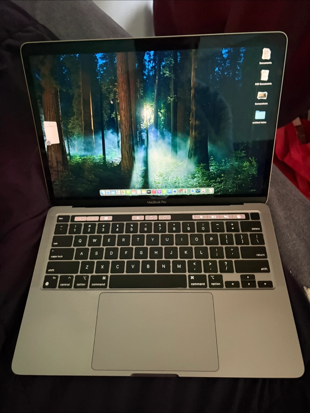 🔹 2020 MacBook Pro 13” M1 – 256GB SSD / 8GB RAM – 96% Battery 🔹 💻 Excellent Condition 💡 Specs: • Model Year: 2020 • Display: 13.3” Retina Display • Processor: Apple M1 (8-core) • RAM: 8GB • Storage: 256GB SSD • Battery Health: 96% • Color: [Space Gray or Silver – specify] • macOS Sequoia 15.5 • Condition: Gently used, no cracks, dents, or major scratches. All functions work perfectly. • Comes with: Original Apple charger + cable + laptop stand