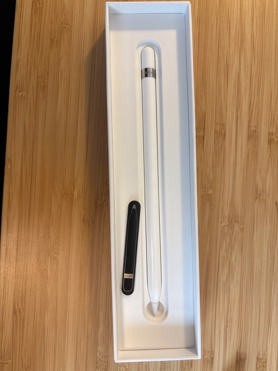 89First generation Apple Pencil. Includes original box and packaging. White. Product is functional without any errors. Requires a compatible iPad with a lightning port. Includes a magnetic pencil placement holder.