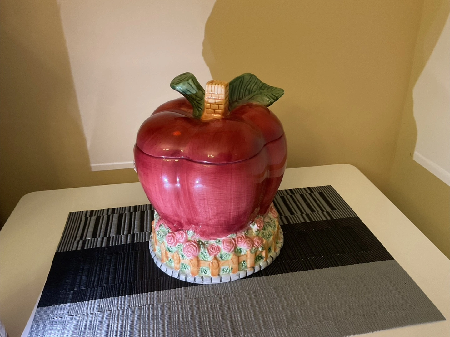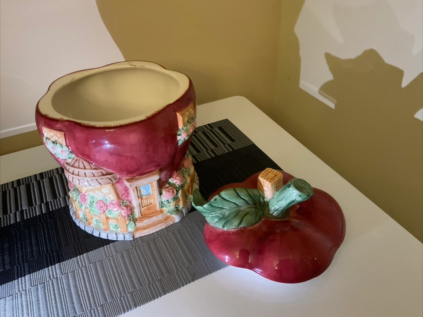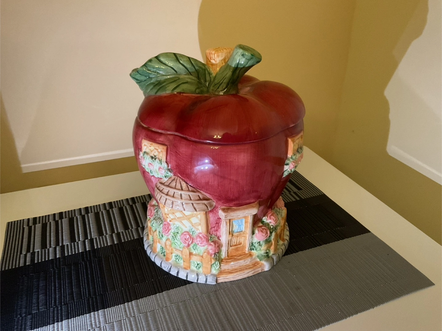 Here's an adorable apple-shaped cookie jar! It's in great condition and ready to hold your favourite treats. The jar features a cute house design with roses around the base and a leafy apple lid.