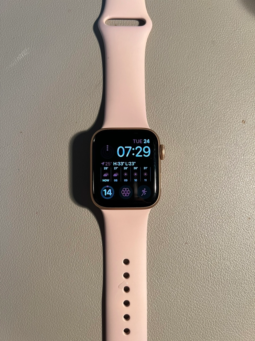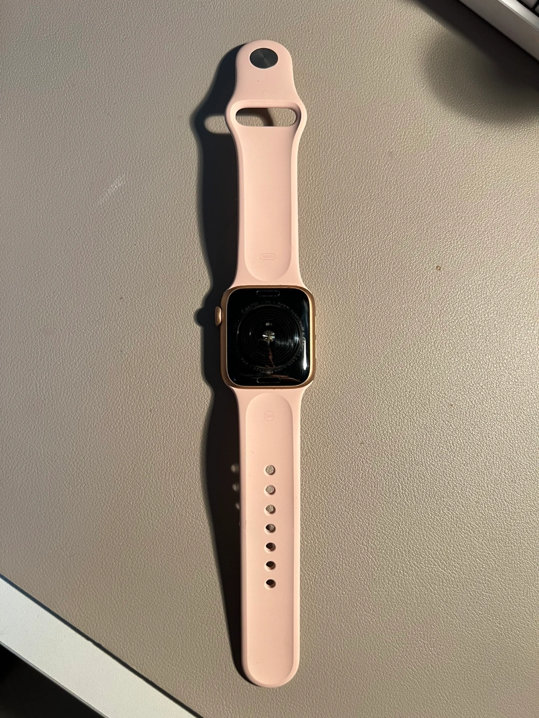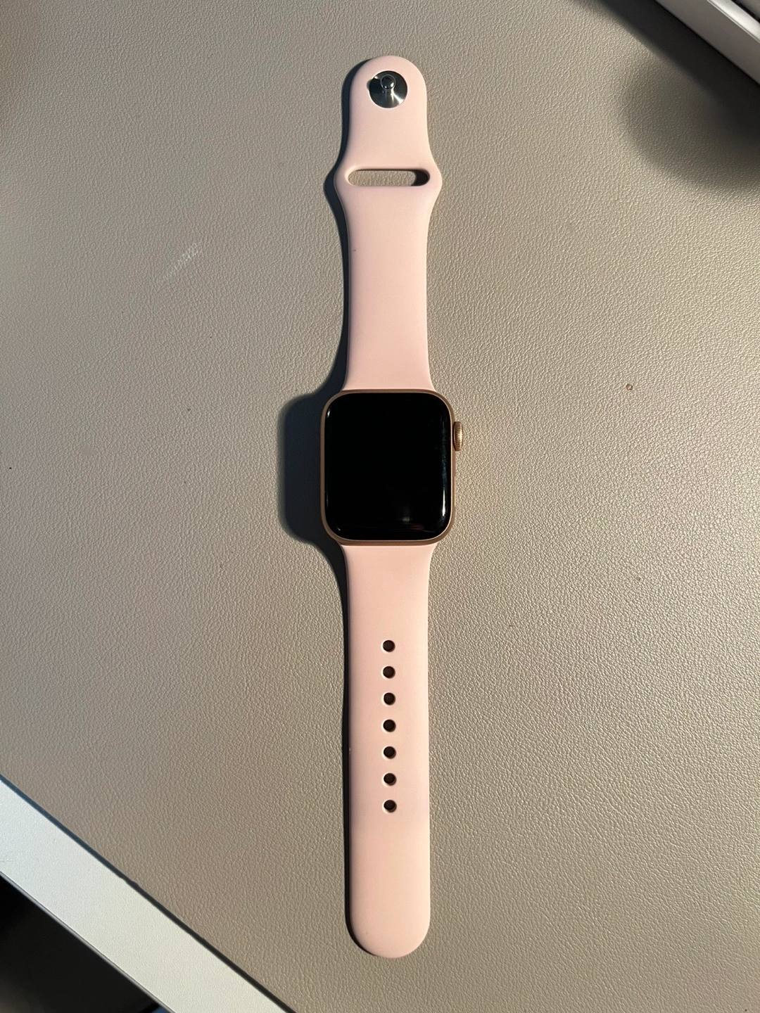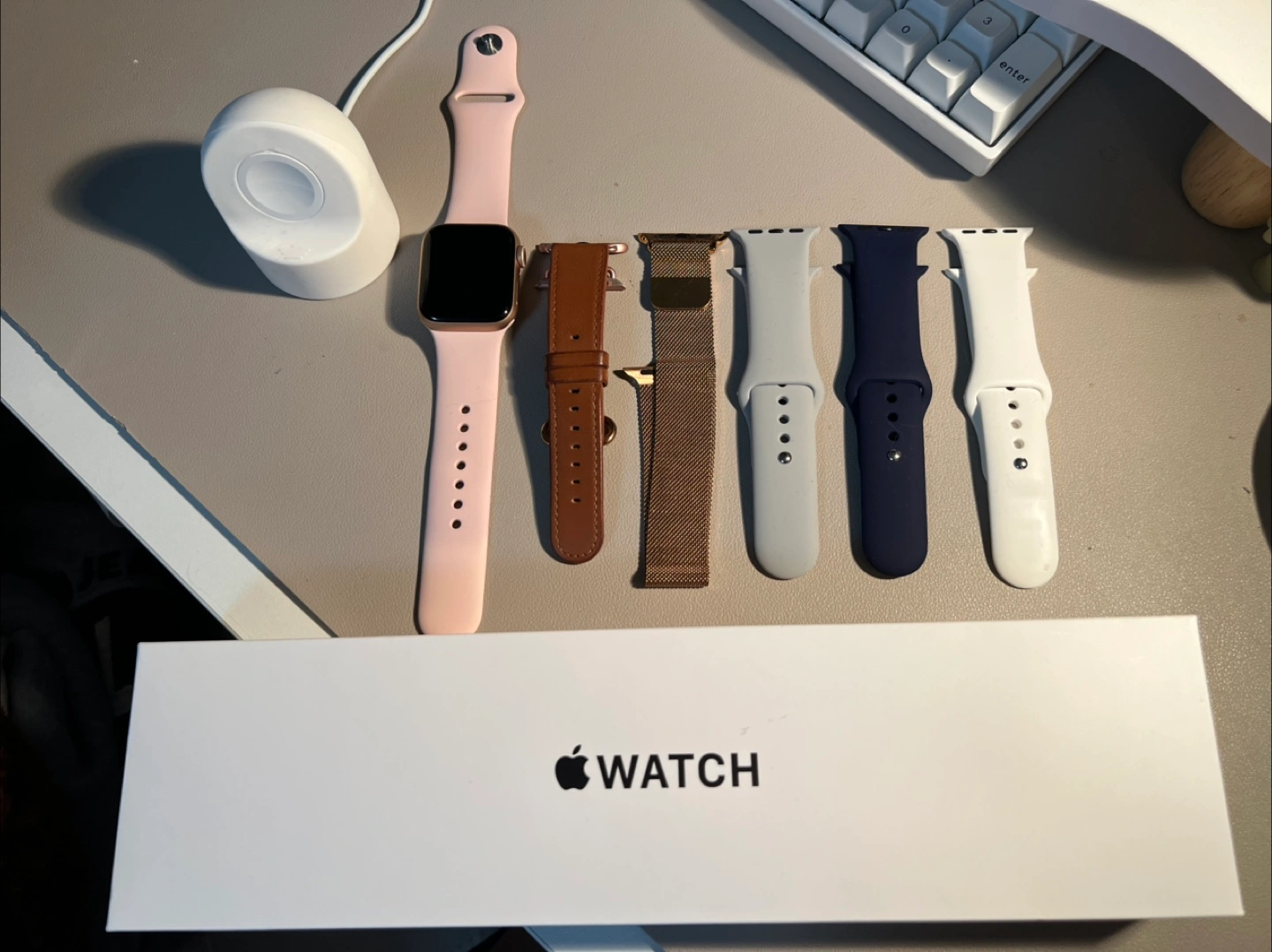 10Selling an Apple Watch SE 40mm in rose gold. In great condition, no visible scratches or dents. It comes with five extra bands along with the original charger, charger stand, and box.