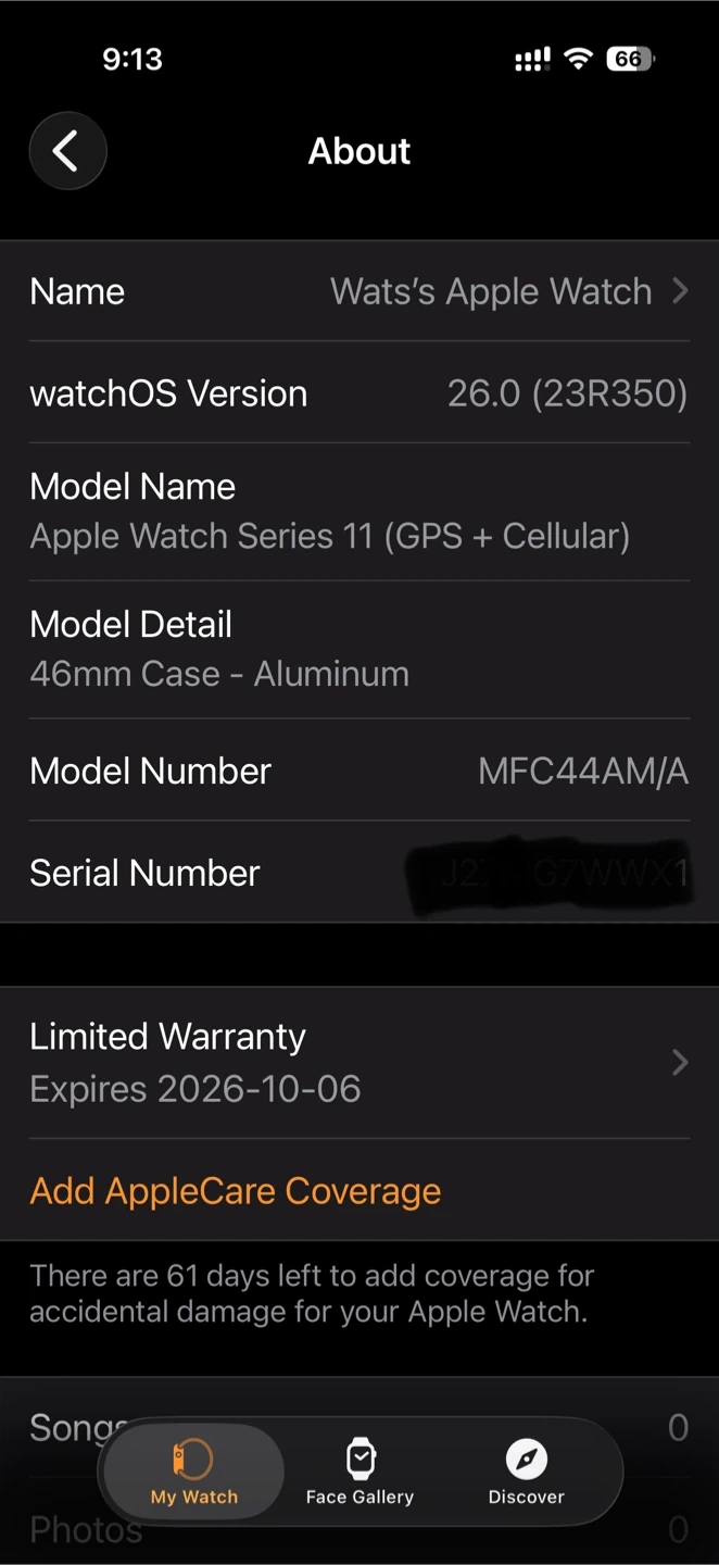 76Selling a like-new Apple Watch Series 11, 46mm, in Jet Black! This GPS + Cellular model comes with its original box and accessories. The model number is MFC44AM/A. The watchOS version is 26.0 (23R350). It has an aluminum case. Don't miss out!