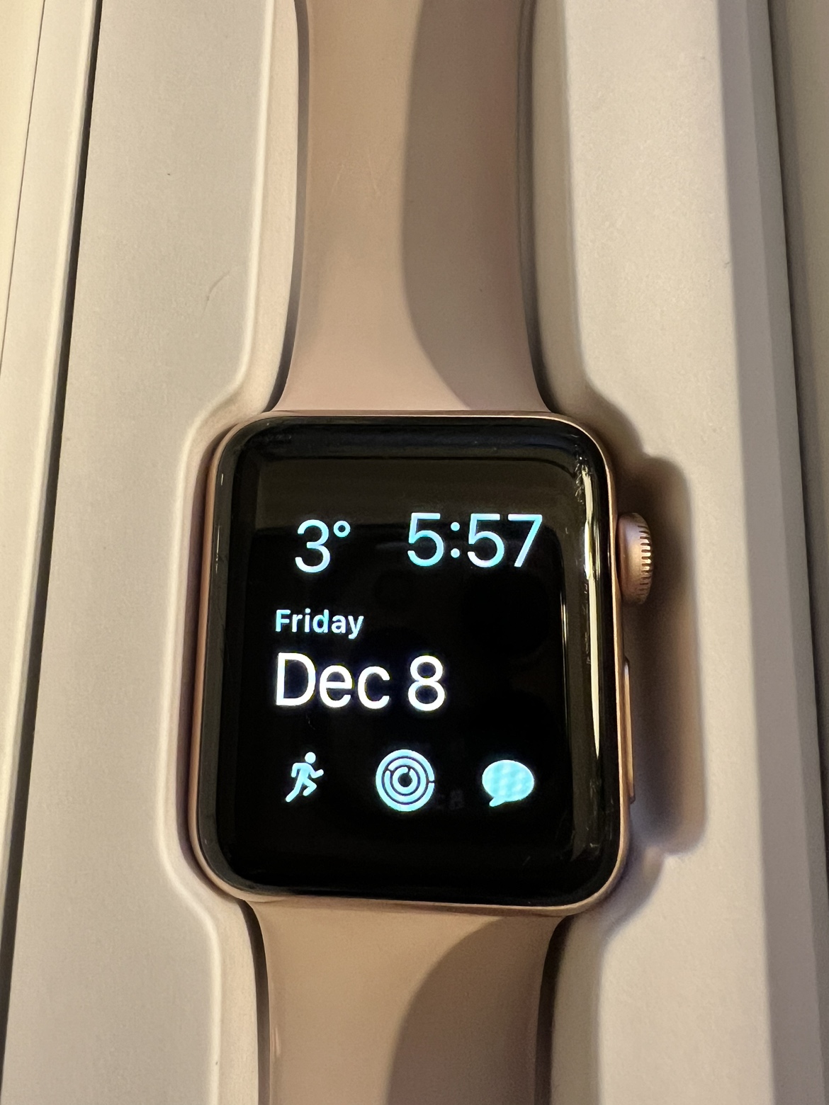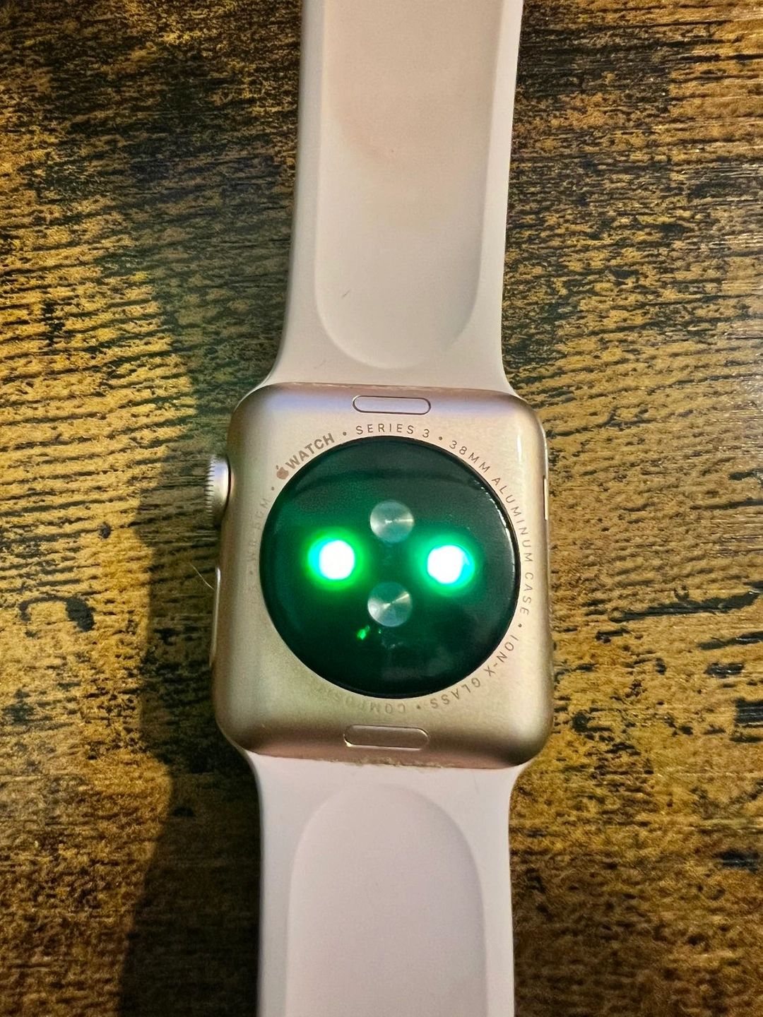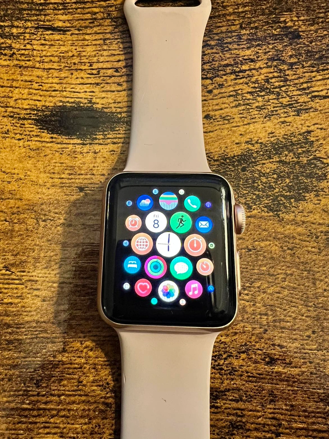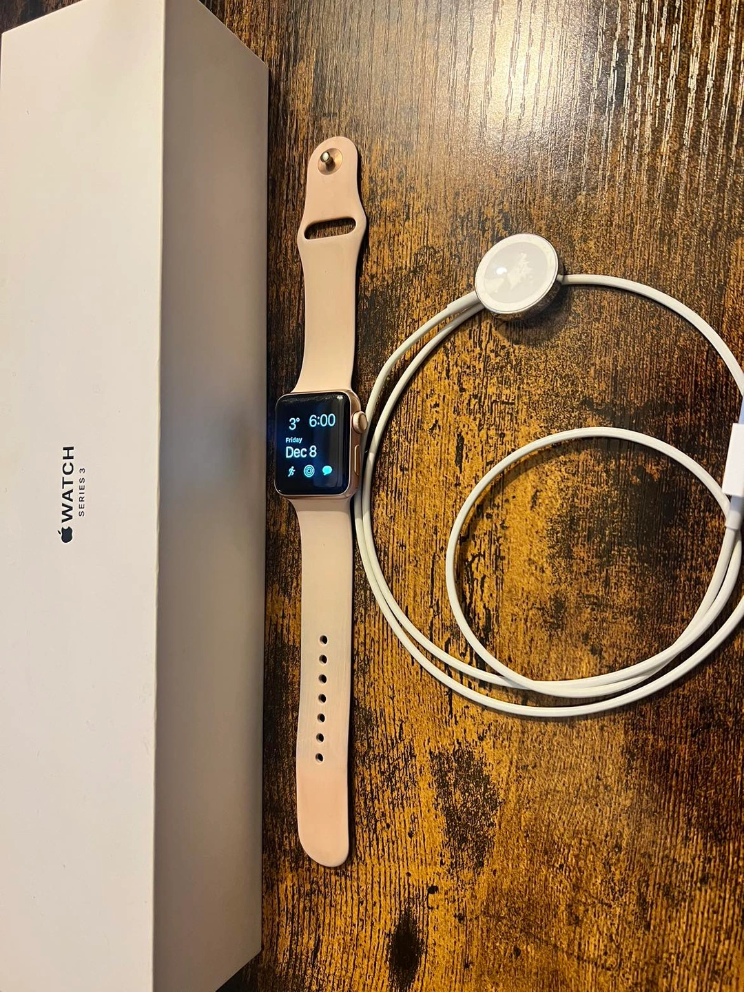 19Apple Watch Series 3 for sale Rose gold. 38mm. GPS. Waterproof. Includes charger. Works great. The band is slightly discoloured, but otherwise in excellent condition. Battery lasts the full day even with tracking a workout. Note: the watch has been reset to factor settings and unpaired (took those pics before resetting it to show you that it works)
