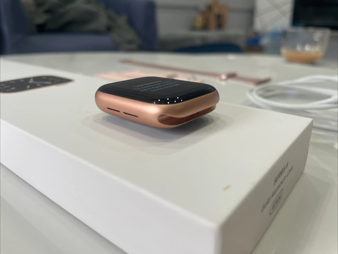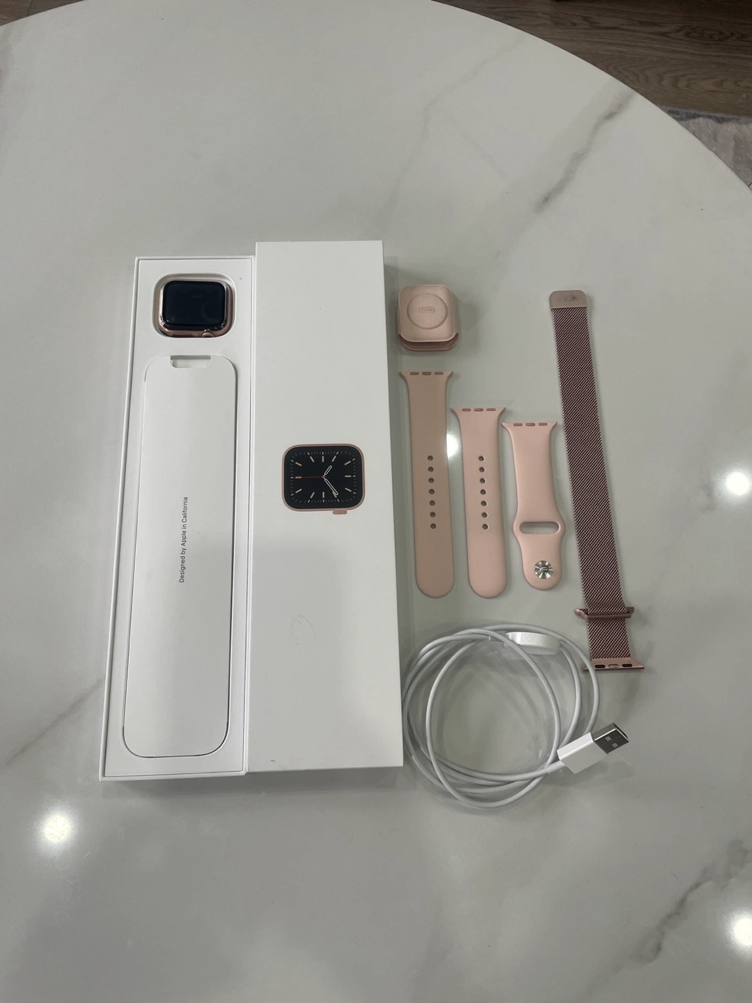 Selling an Apple Watch Series 6 with a gold aluminum case. It comes with the original box and all included components, including the charger and different band options. It's in great condition and ready for a new owner!