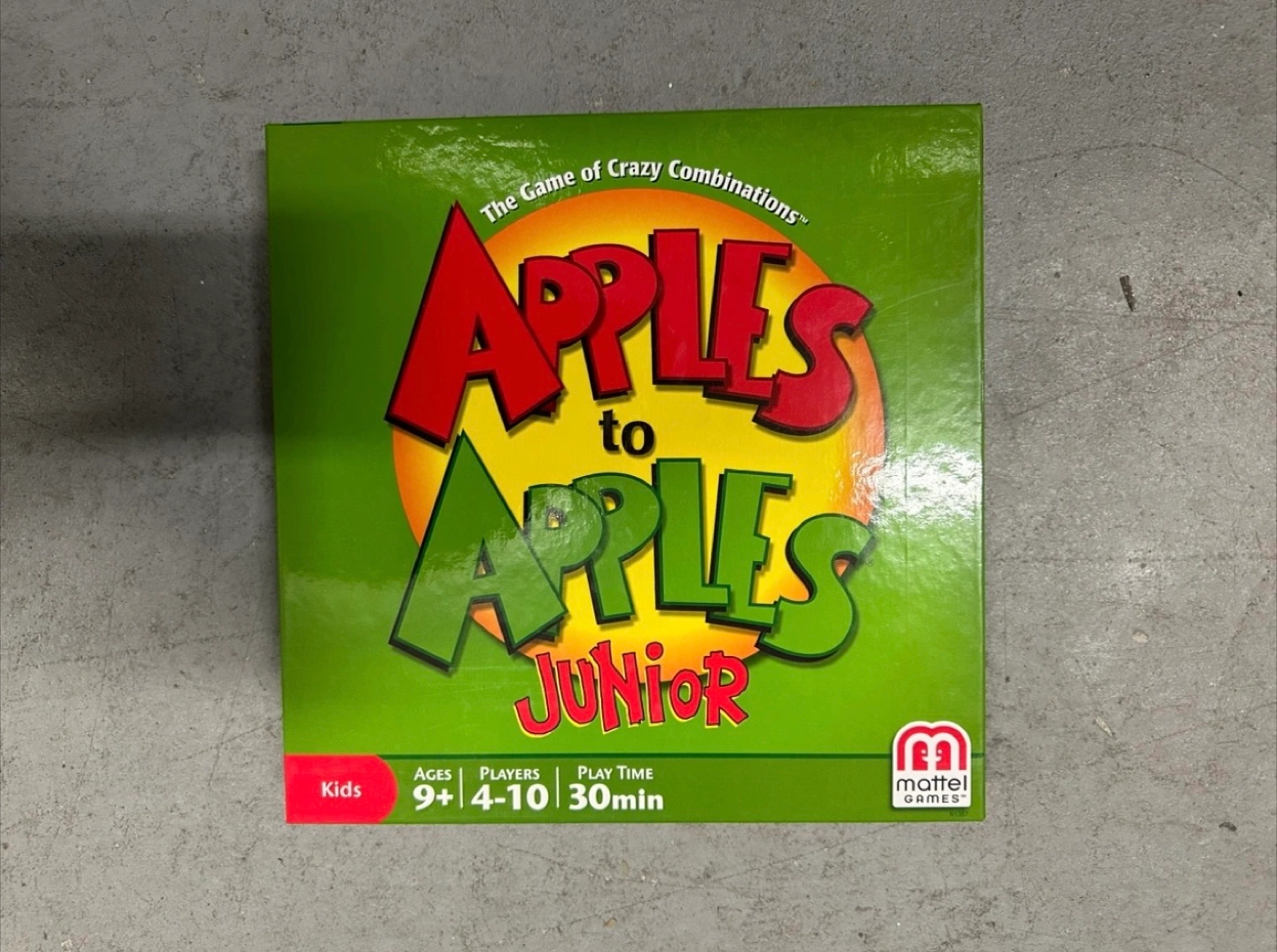 1000+Apples to Apples Junior game. The box is colourful. Features the game's title. Play time is 30 minutes. It is an awesome family activity to bring people together.
