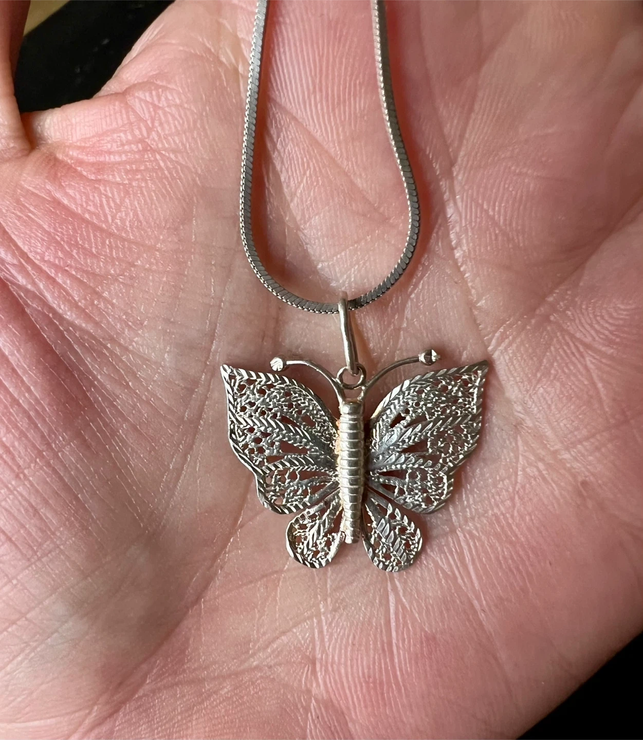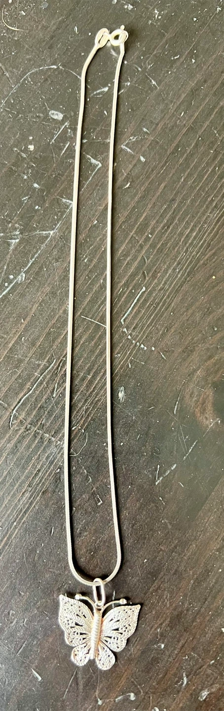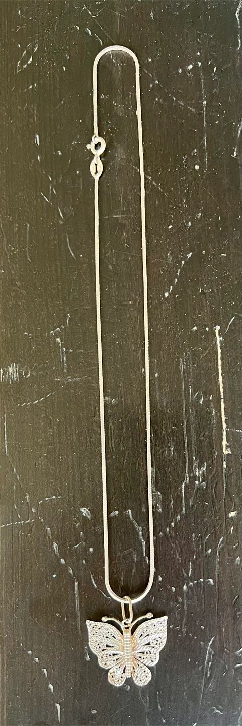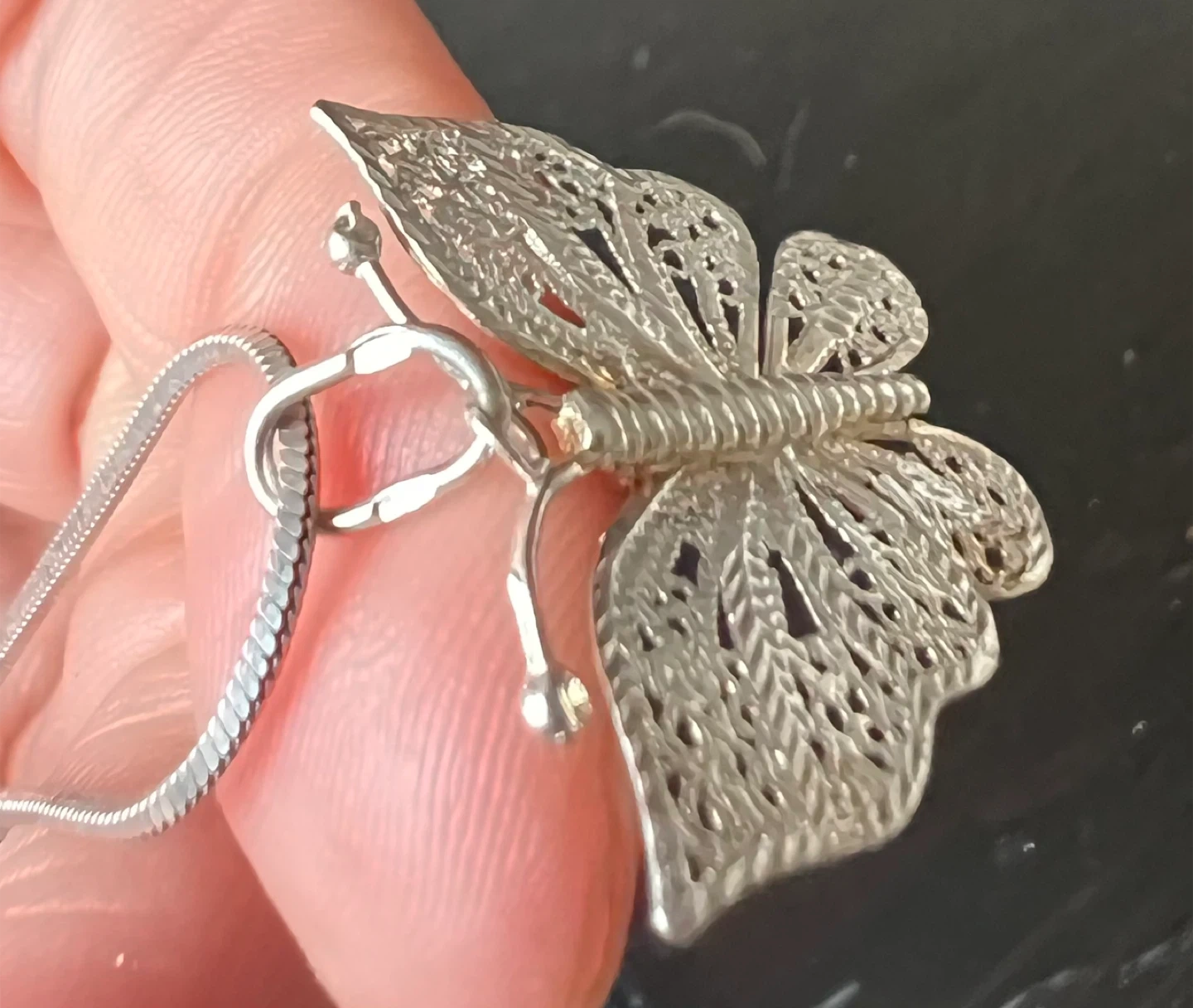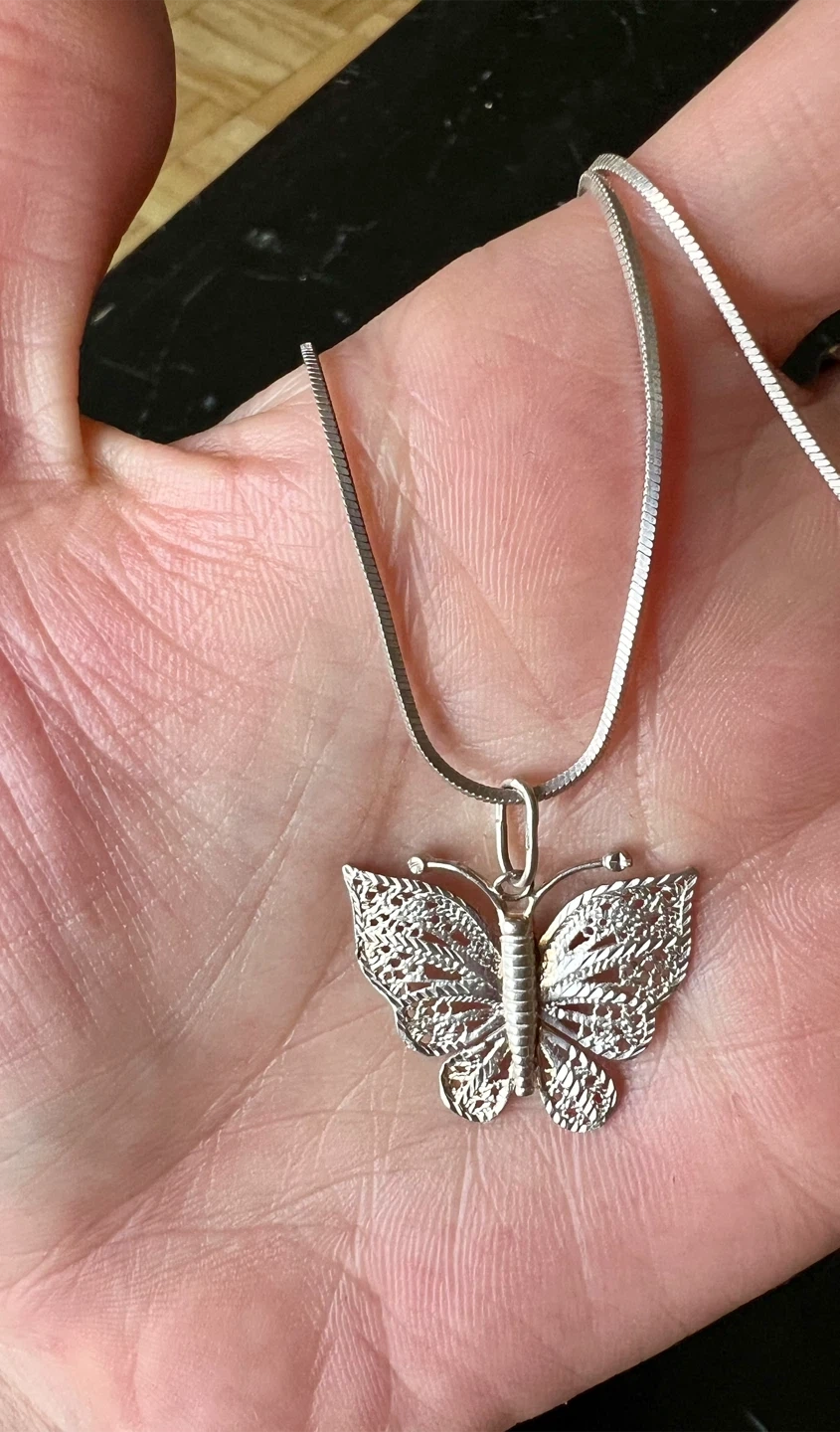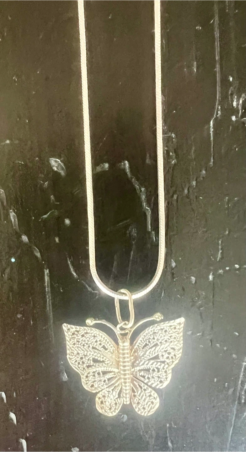The butterfly pendant features a delicate filigree design with intricate wing details, giving it an elegant and timeless look. It hangs on a classic snake chain, which lays smoothly on the neckline and is very comfortable to wear.