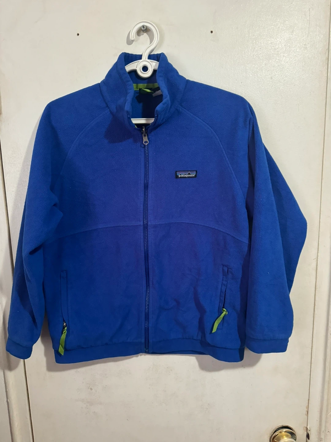 Blue Patagonia fleece jacket for kids. It's a size L (12). Made in the U.S.A. Material is polyester fleece, perfect for staying warm outdoors!