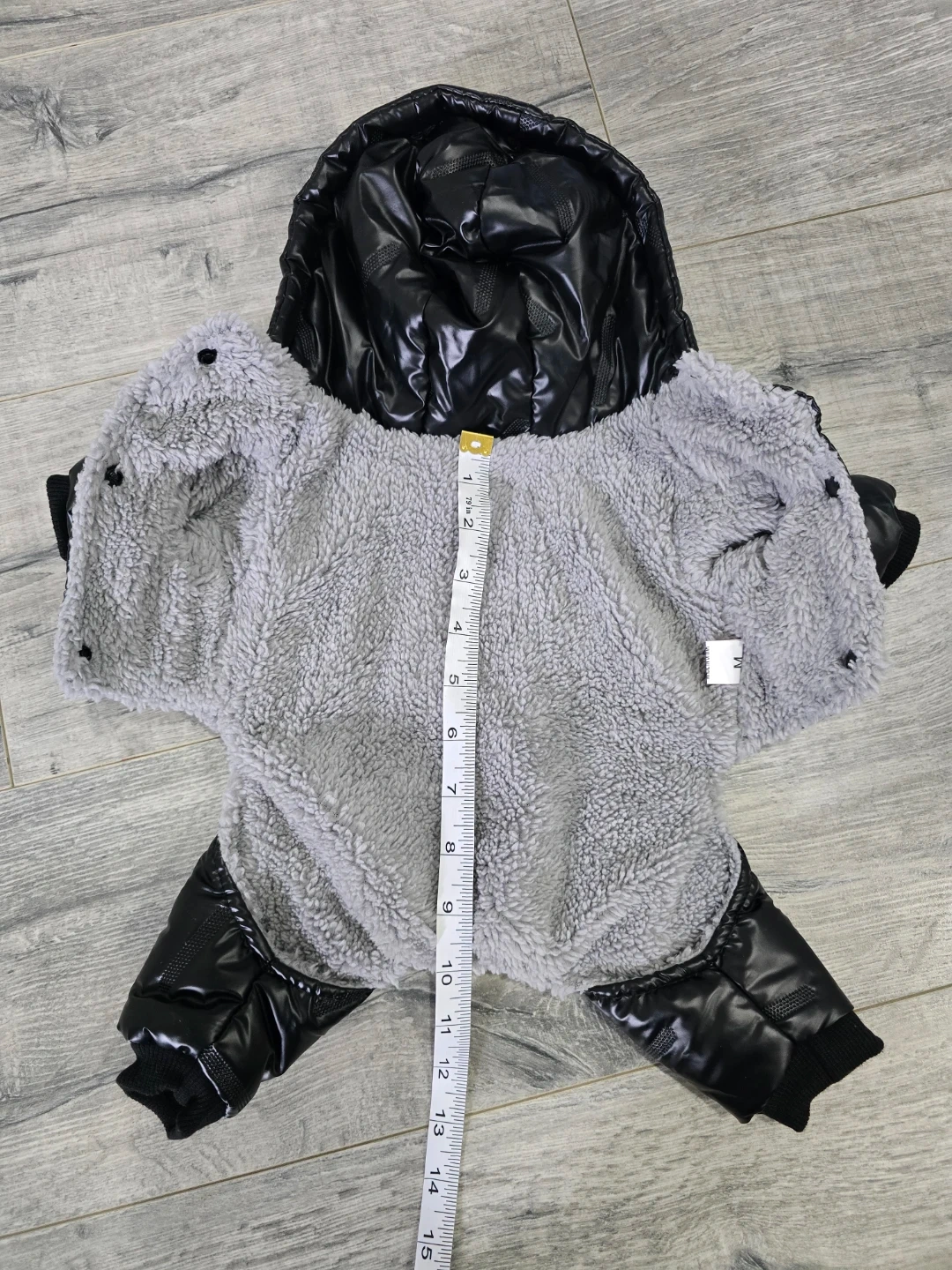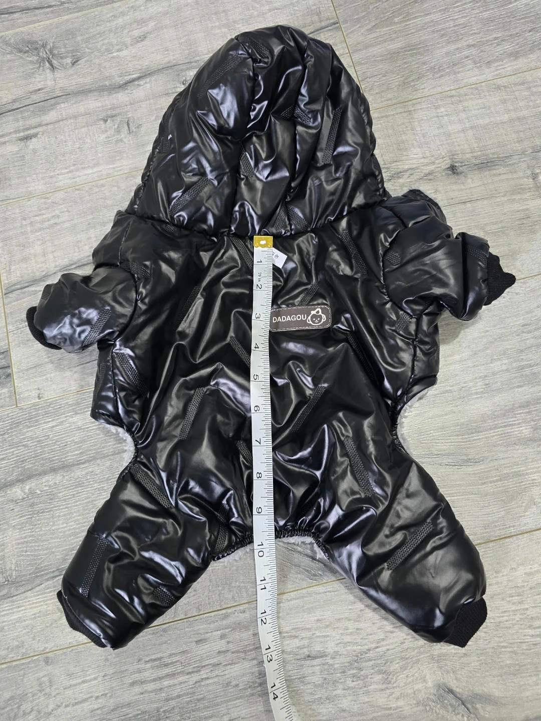 This shiny black winter jacket by DADAGOU is designed for dogs. It features a cozy fleece lining and a hood to keep your pet warm. Water-resistant material helps protect against light precipitation.