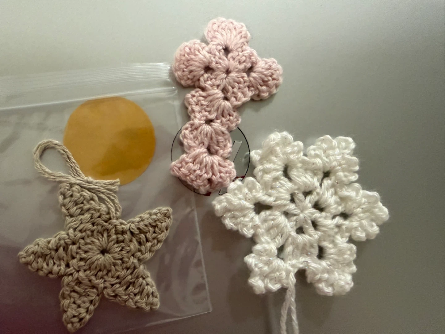 Three handmade crocheted ornaments. Includes a beige star with a loop, a pink cross, and a white snowflake. These are lovely for holiday decorations!