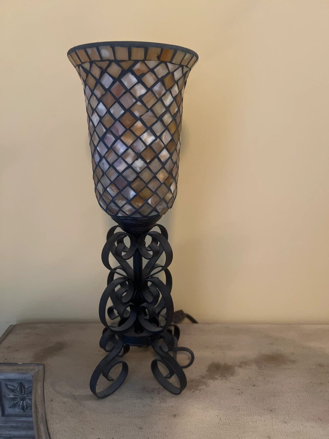 2 attractive table lamp features a mosaic glass shade with warm, earthy tones. It's supported by an ornate black metal base with a scrolled design. A unique piece for any room! Set of 2 for $25