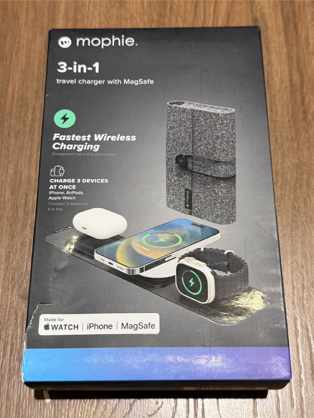 Charge your iPhone, AirPods, and Apple Watch all at once with this Mophie 3-in-1 travel charger. It offers fastest wireless charging and is made for Watch, iPhone, and MagSafe devices. This is a travel-friendly charging solution.