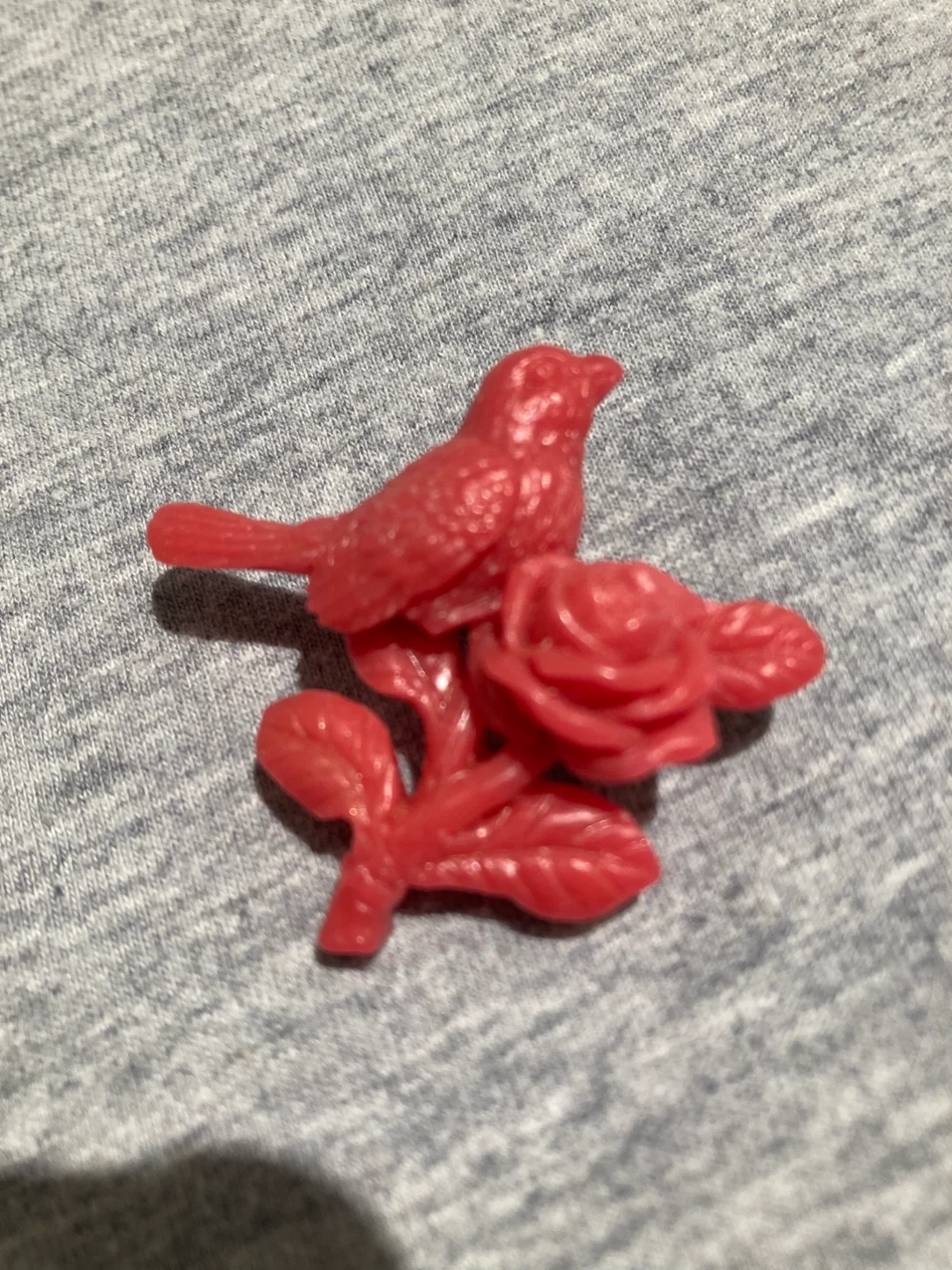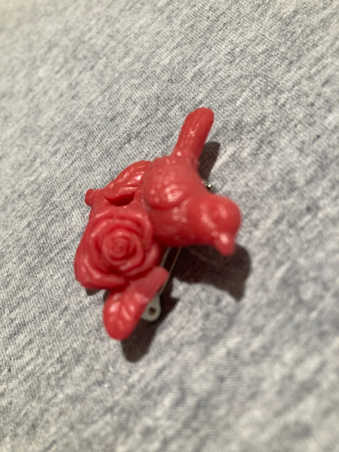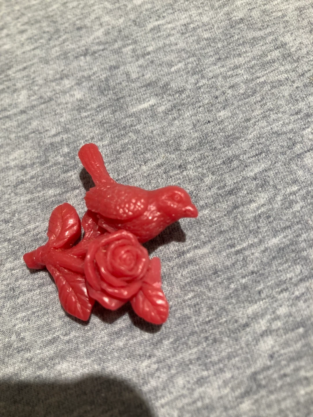A cute red plastic brooch featuring a bird perched on a rose branch. It's a fun accessory for jackets or bags!