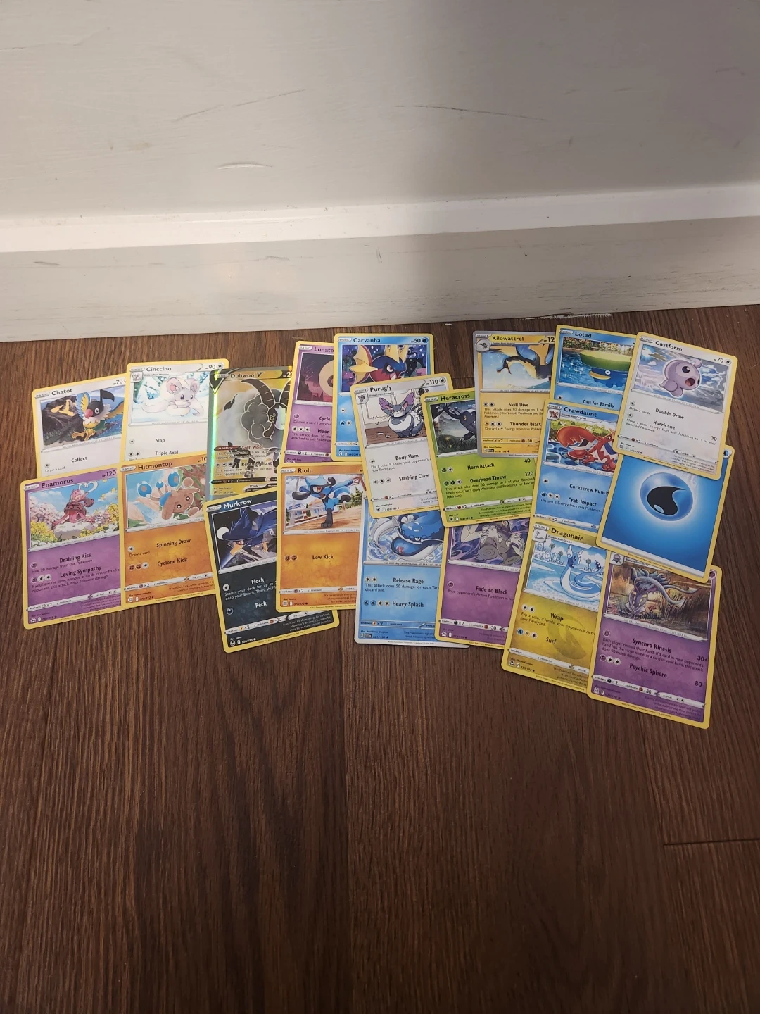 This lot includes a variety of Pokemon trading cards. Specific cards visible include holo Dondozo and Dubwool V. Cards are in good condition.