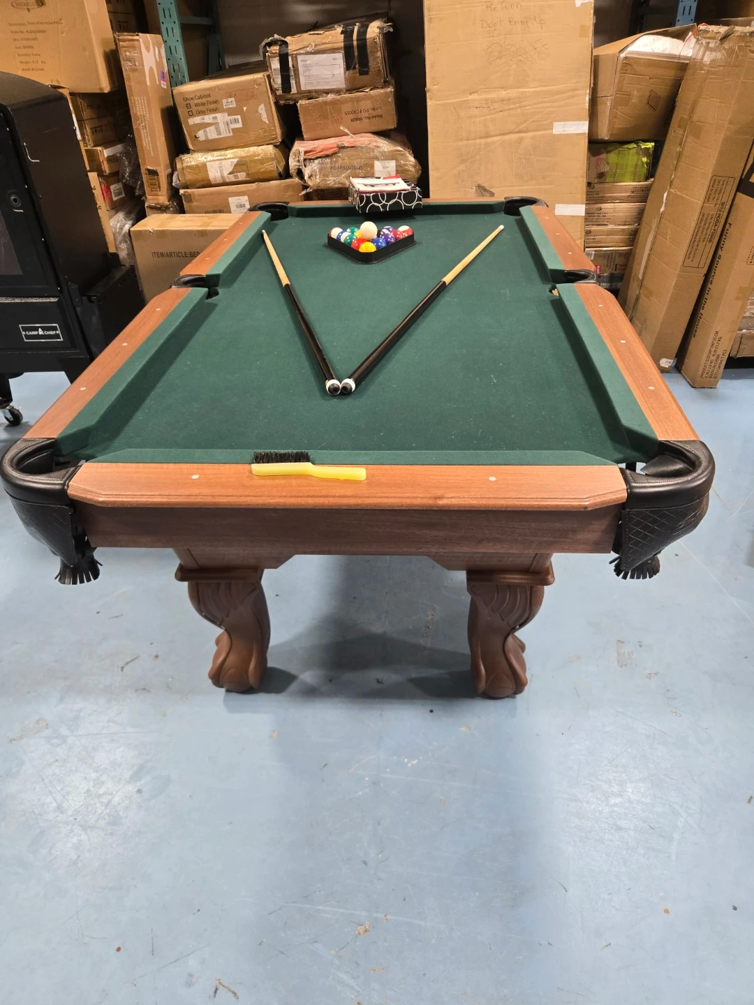 This is a green felt pool table. It comes with two cues and a full set of billiard balls. Features ornate wooden legs for a classic look.