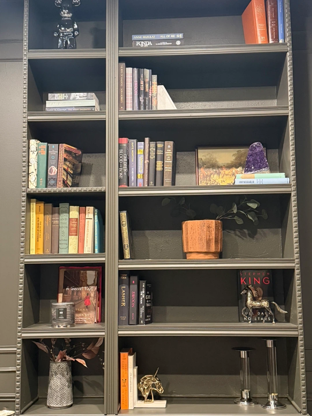 A collection of books displayed on grey bookshelves. Various titles and authors are visible. Also includes decorative items like vases, a globe, and bookends. Perfect for a home library or study.