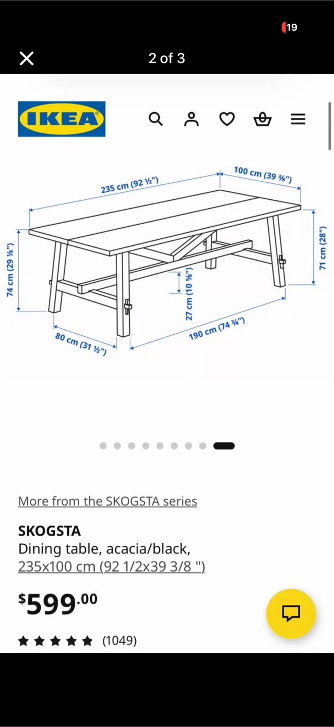 This is the IKEA SKOGSTA dining table. It's made from acacia. Table dimensions are 235 cm long by 100 cm wide. It can seat 6-8 people comfortably.