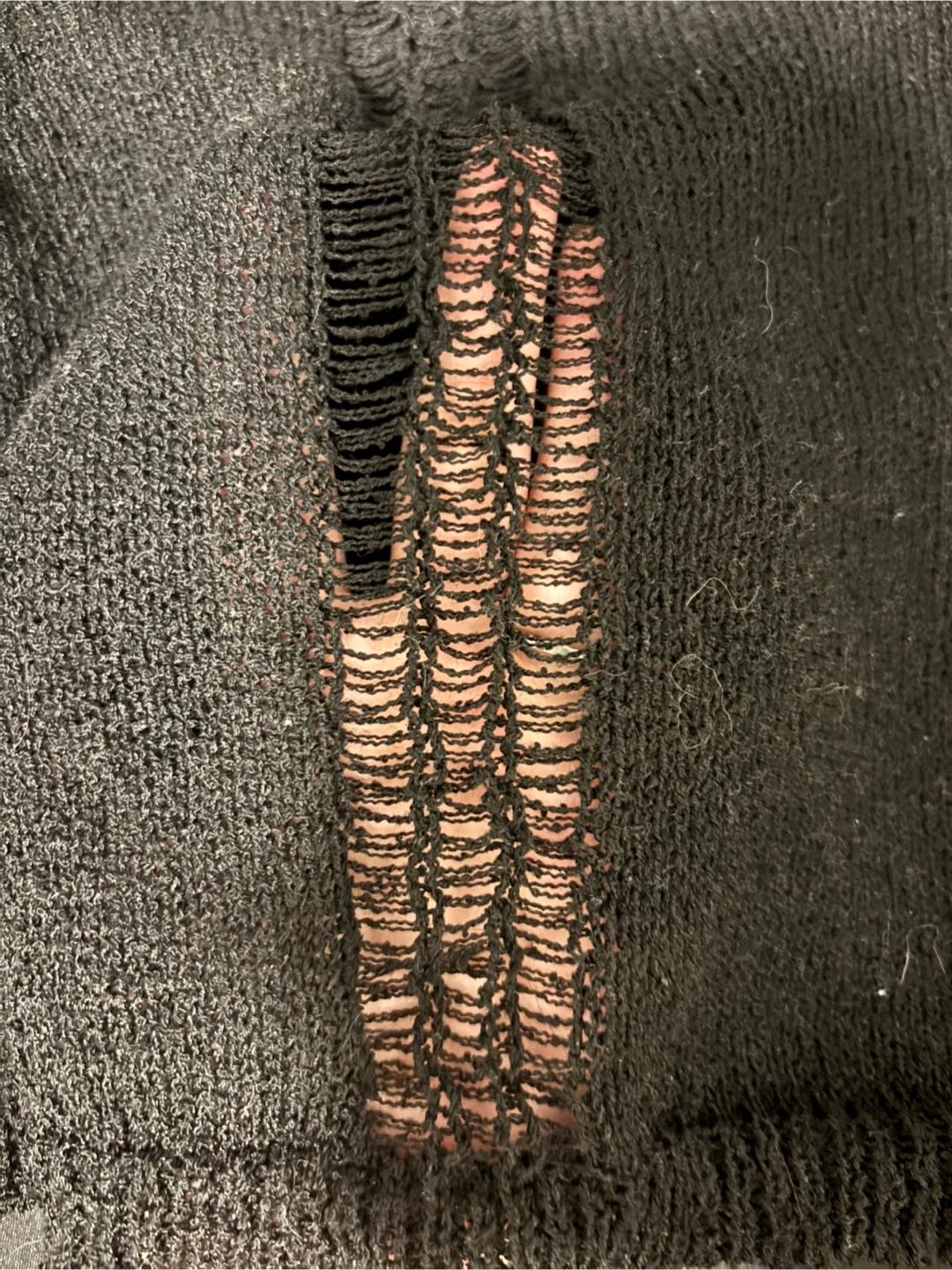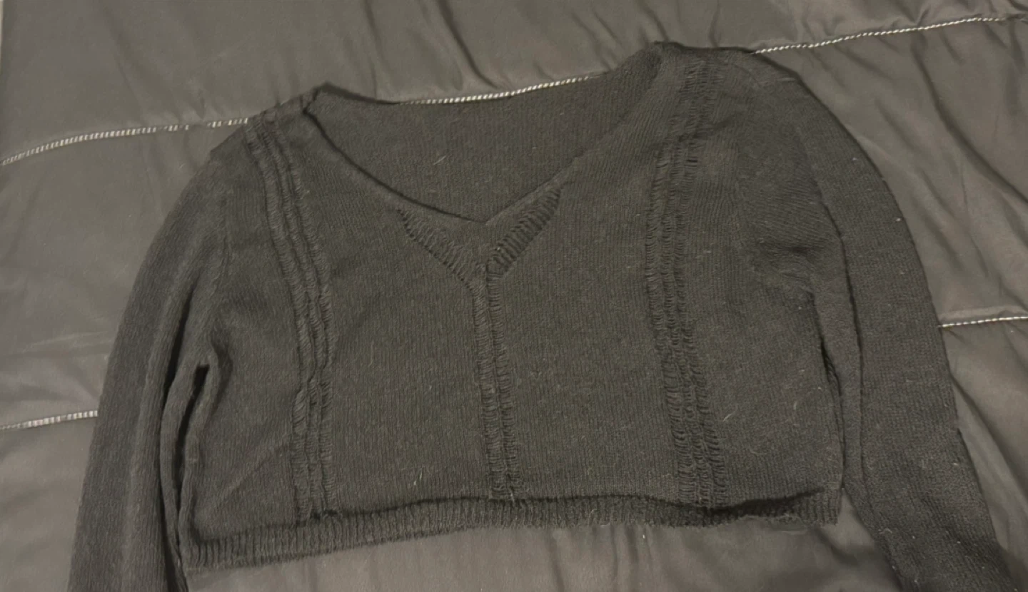 This is a black cropped sweater with a V-neckline. It features distressed detailing on the front . Made from a knitted material, and long sleeved.