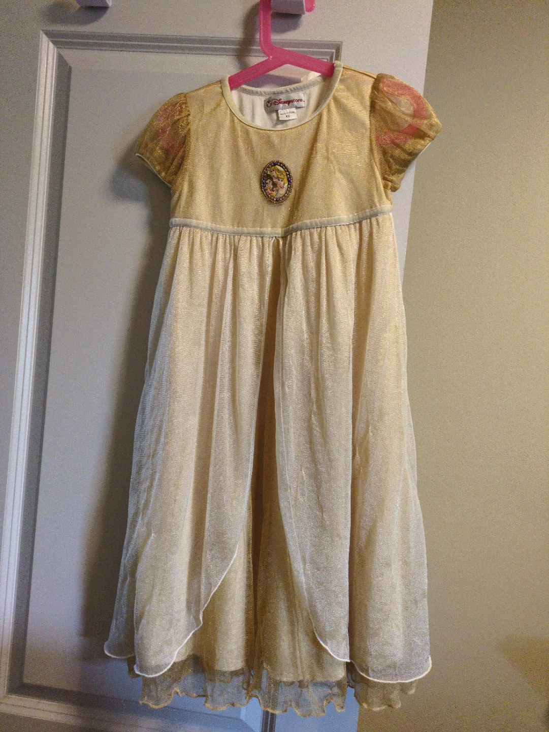 This is a beautiful Disney Princess dress. It features a gold bodice with sparkly puff sleeves. The skirt is made of sheer, shimmery fabric with an overlay.