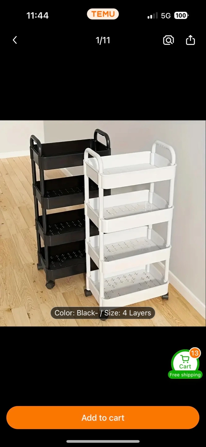 Four-layer storage cart. Black colours available. Features wheels for easy mobility. Great for organization.