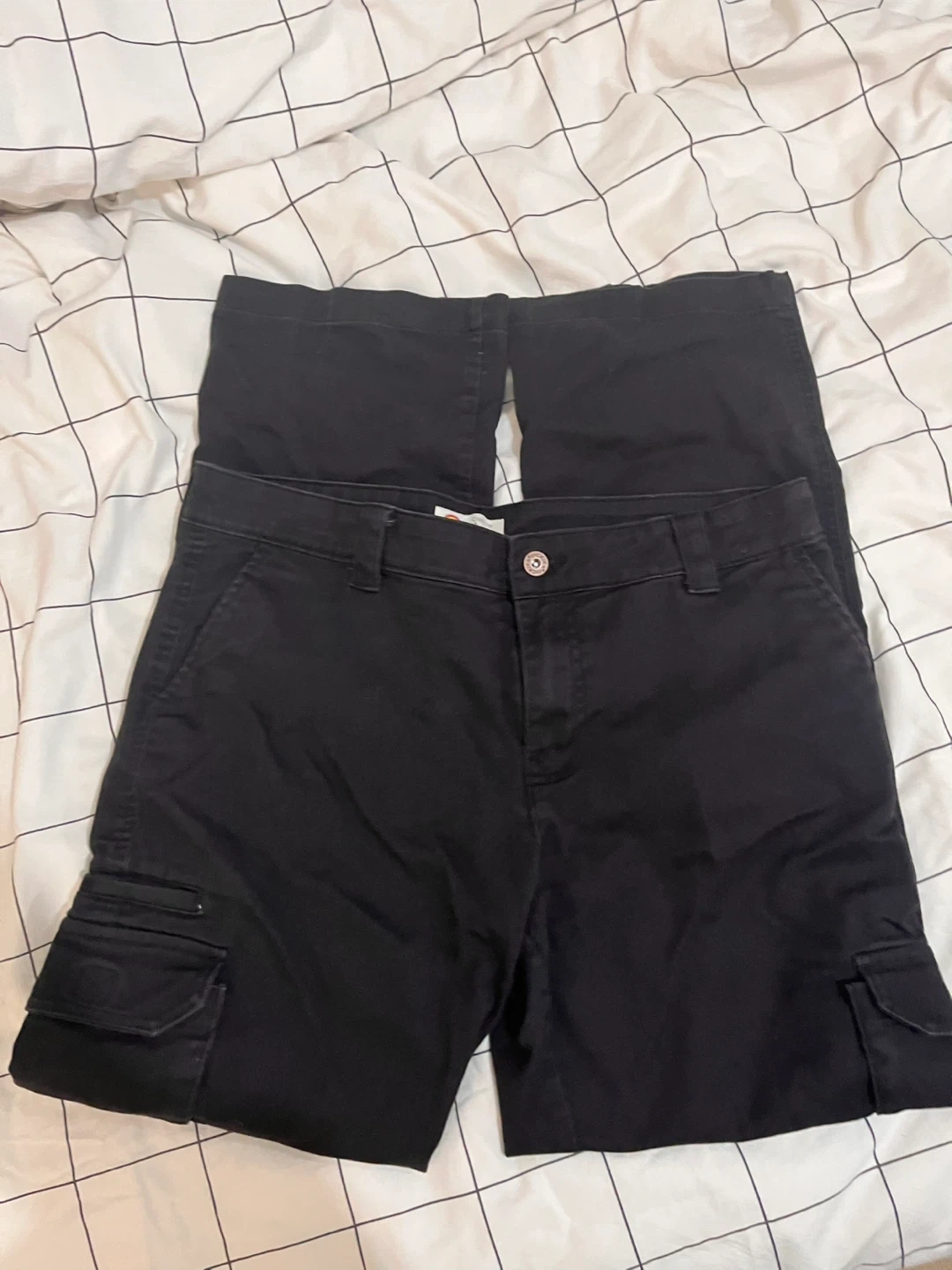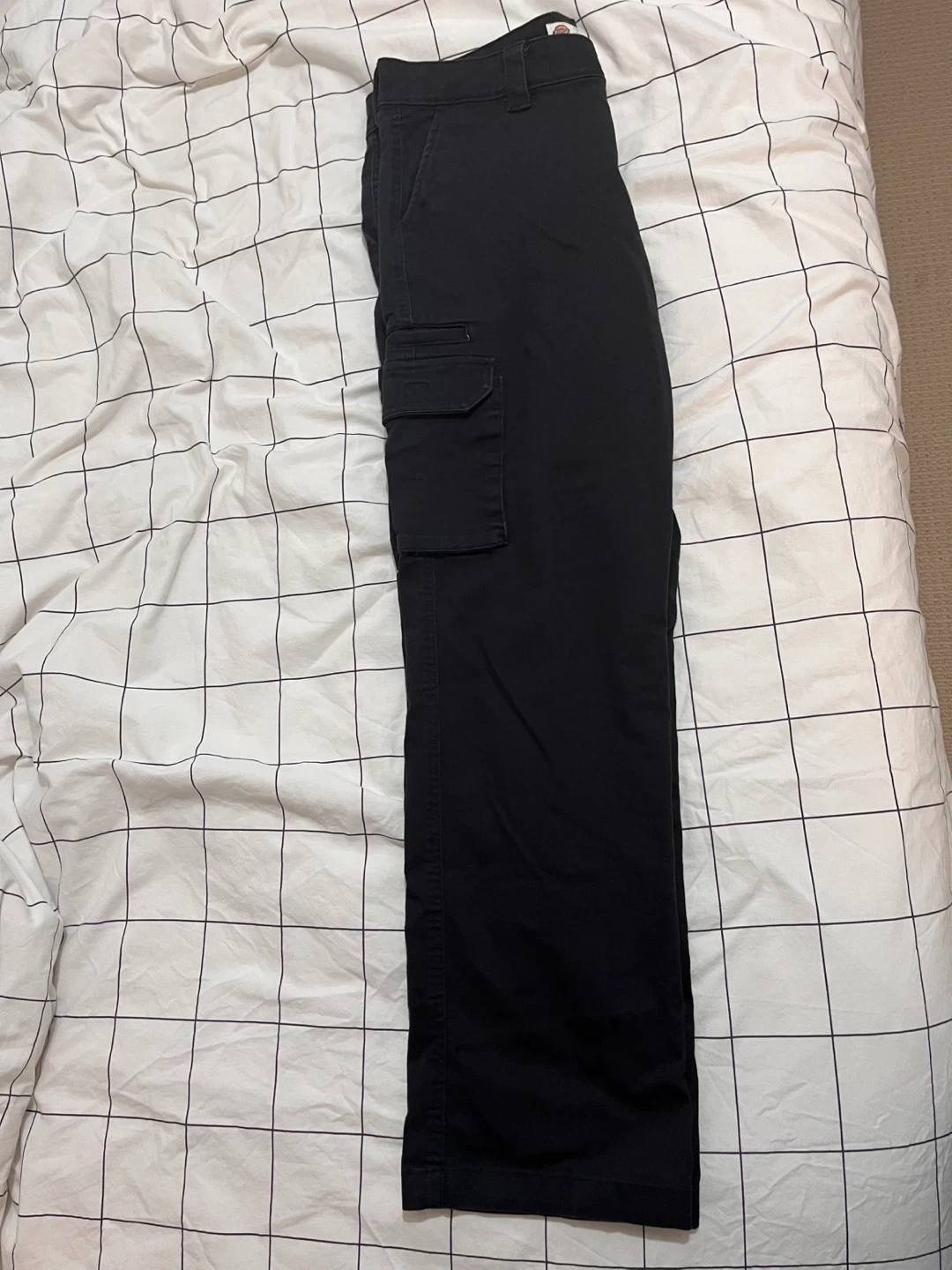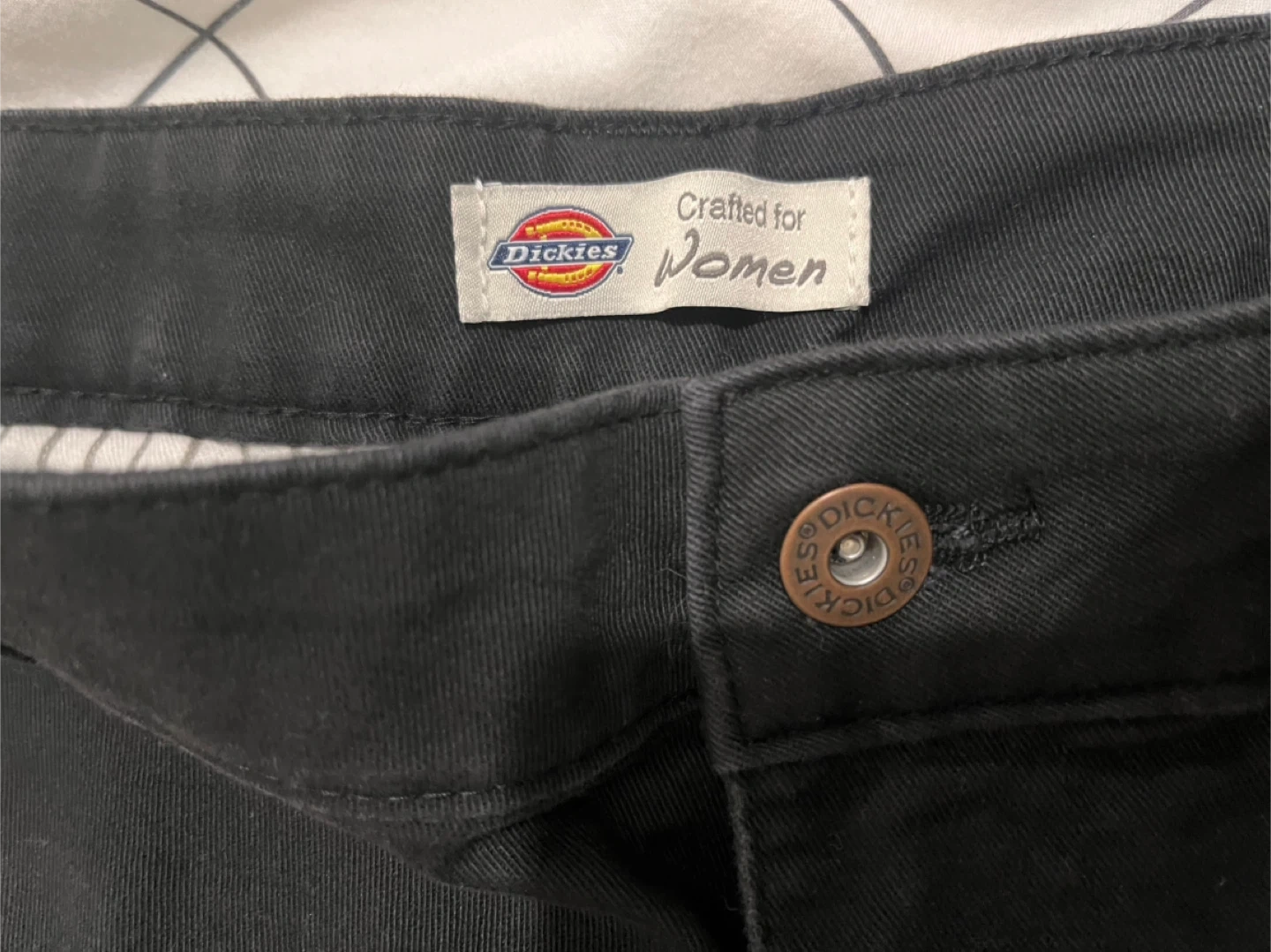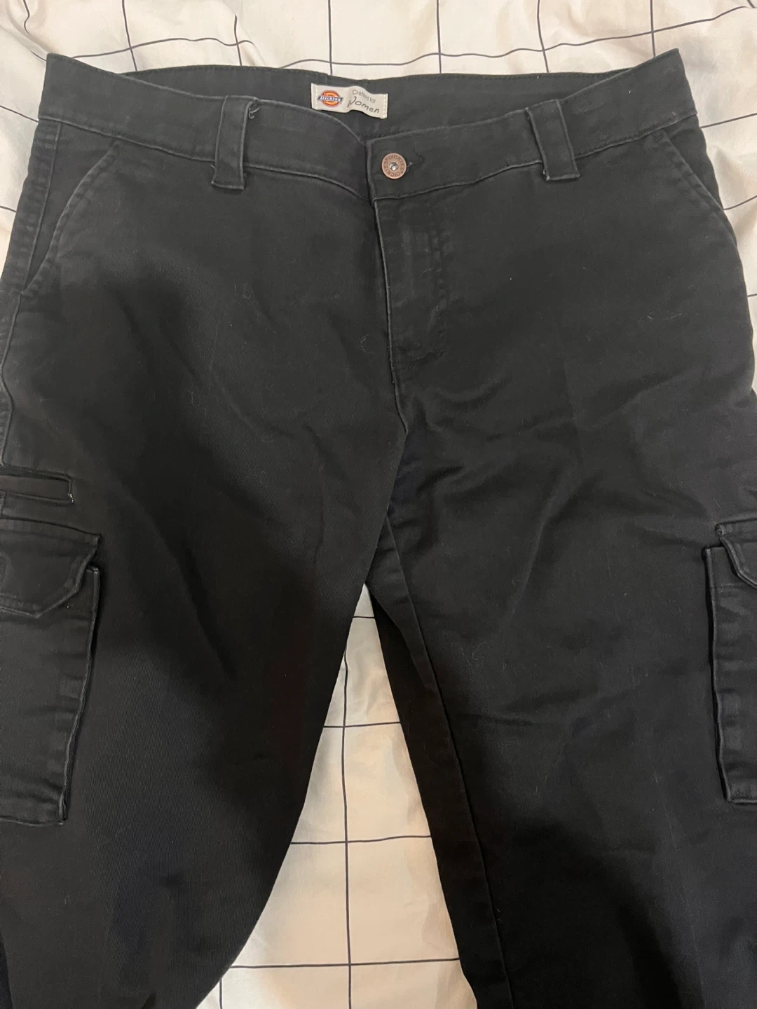 These are black Dickies cargo pants crafted for women. They're made from a durable fabric and feature multiple pockets for utility. These pants are a solid choice for everyday wear or work.
