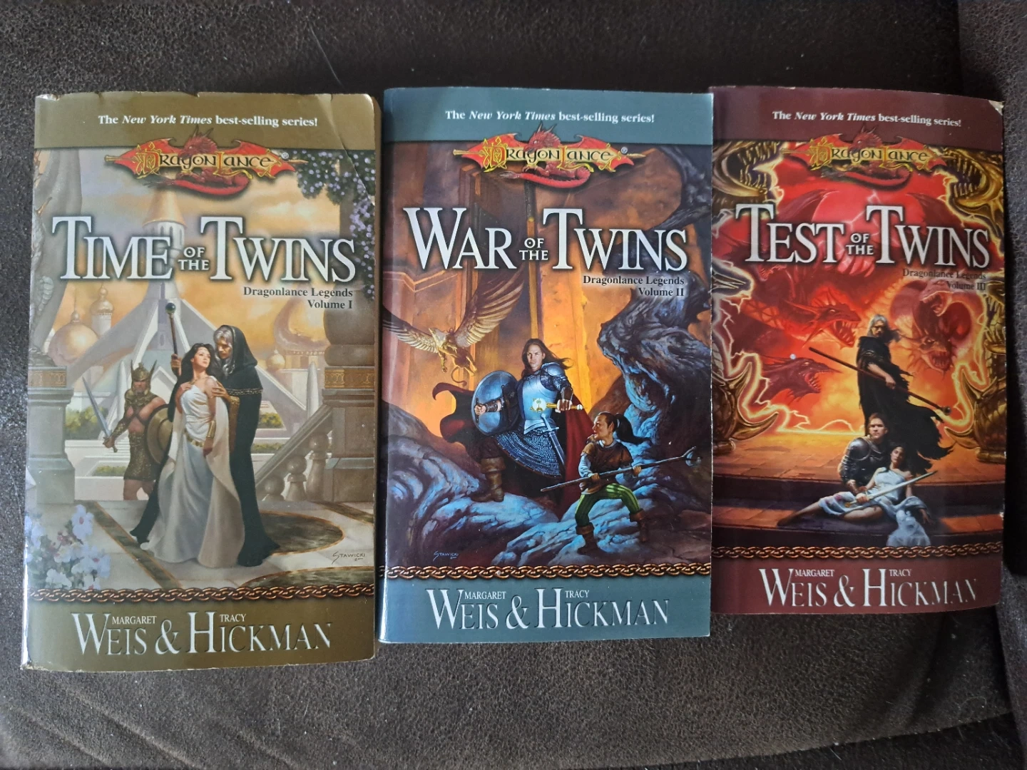 Selling the Dragonlance Legends trilogy by Margaret Weis & Tracy Hickman. It includes 'Time of the Twins Volume I', 'War of the Twins Volume II', and 'Test of the Twins Volume III'. These are New York Times best-selling fantasy novels. Great for any Dragonlance fan!