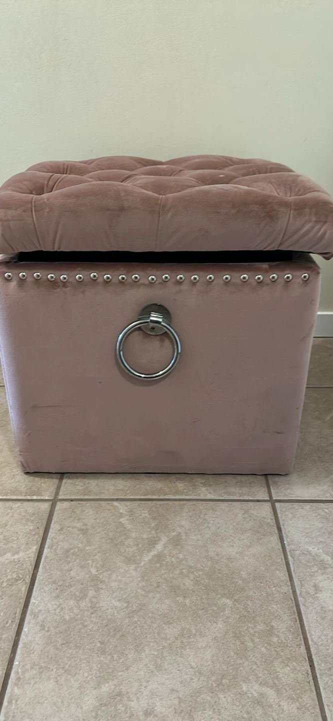 Tufted pink velvet storage ottoman featuring a decorative ring pull on the front. This handy piece offers hidden storage and a stylish accent. Perfect for a bedroom or living room!