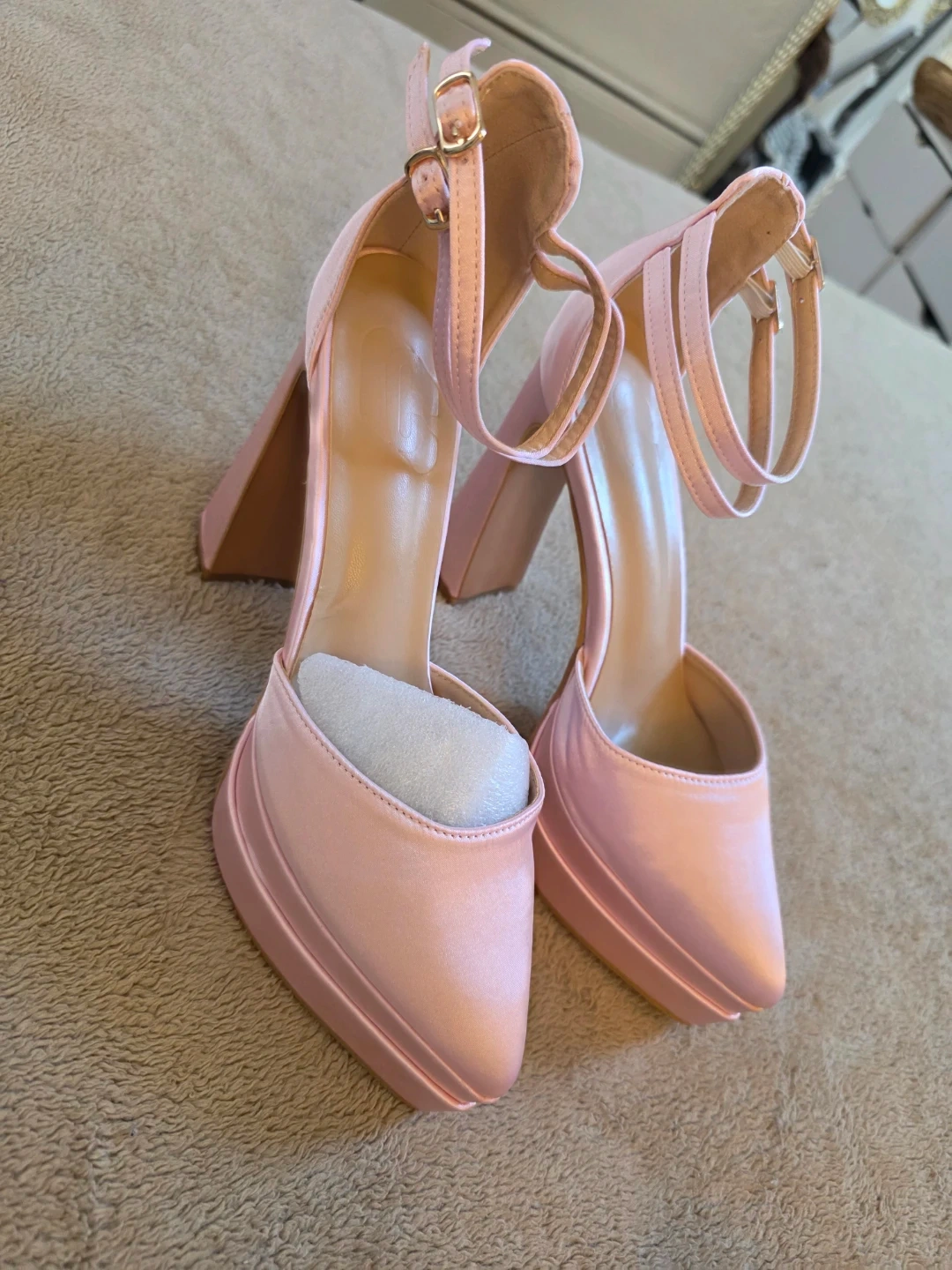 These stylish pink heels feature a chunky block heel and a platform sole. They have adjustable ankle straps for a secure fit. The satin-like material gives them a sleek finish.