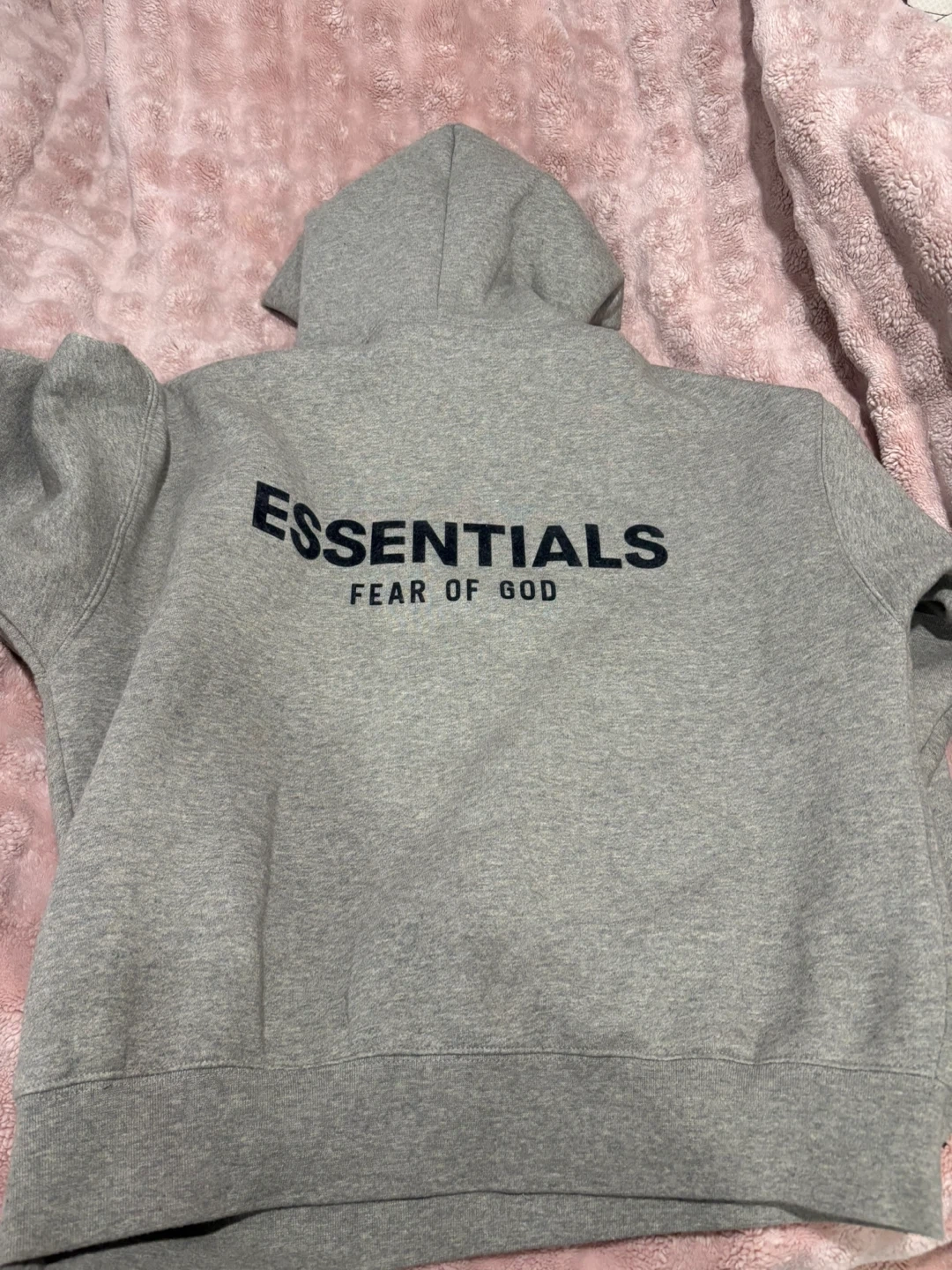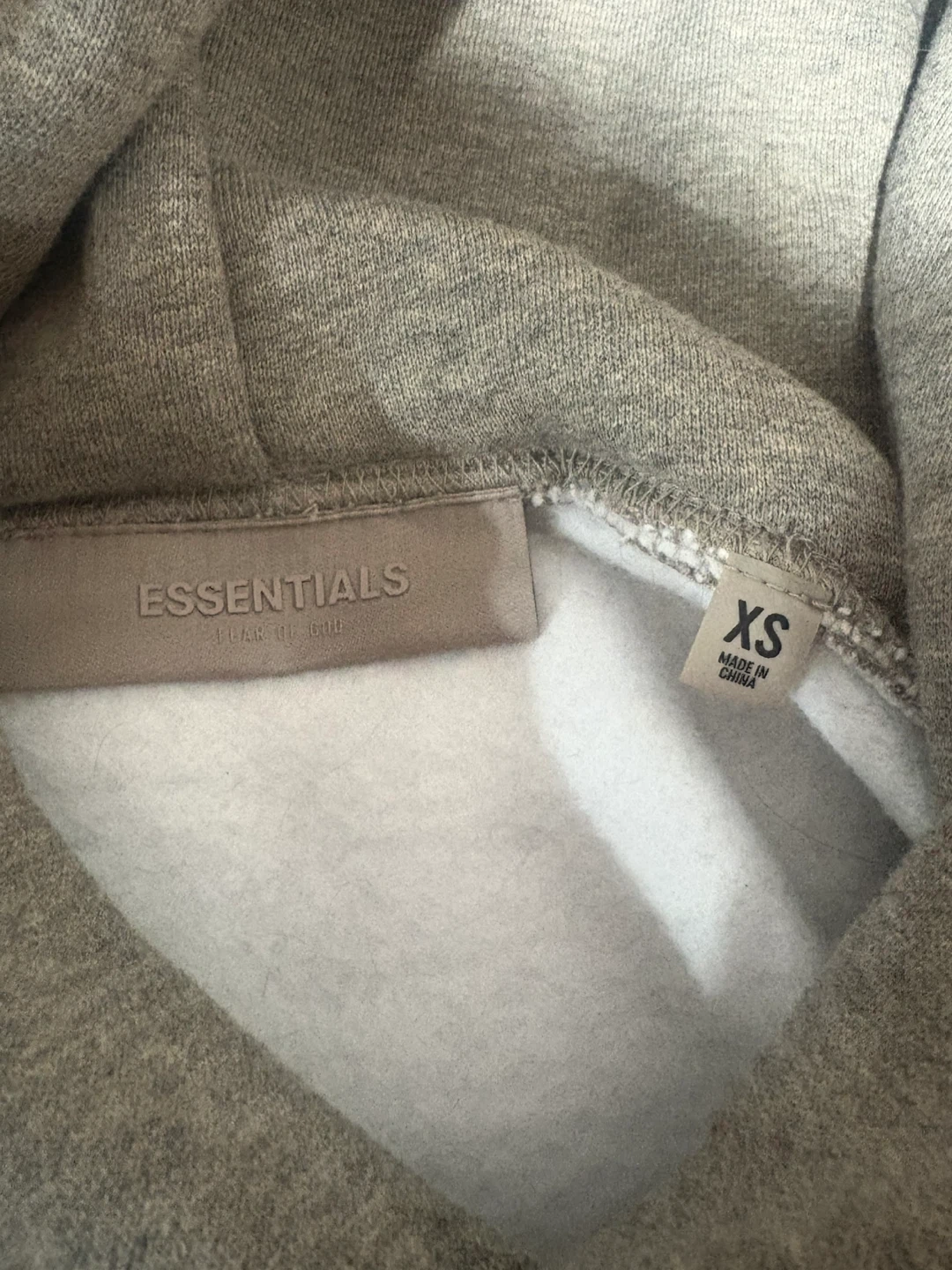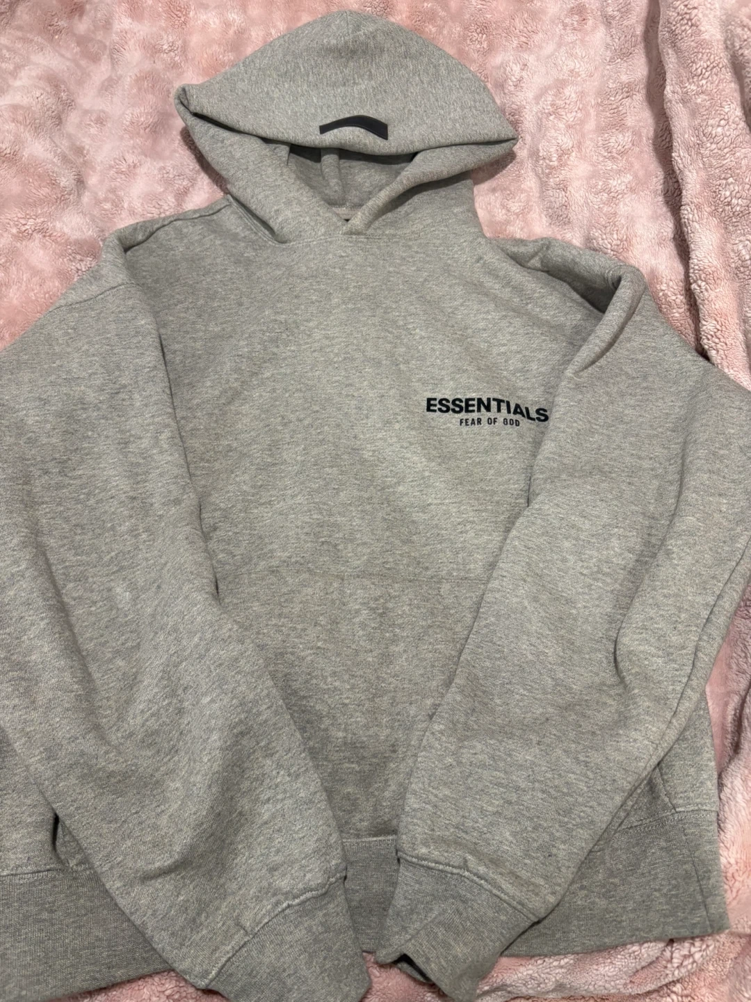This is a grey hoodie from Fear of God Essentials. It's a size XS. but fits like a medium Made of a soft, comfortable material. Like New only worn once