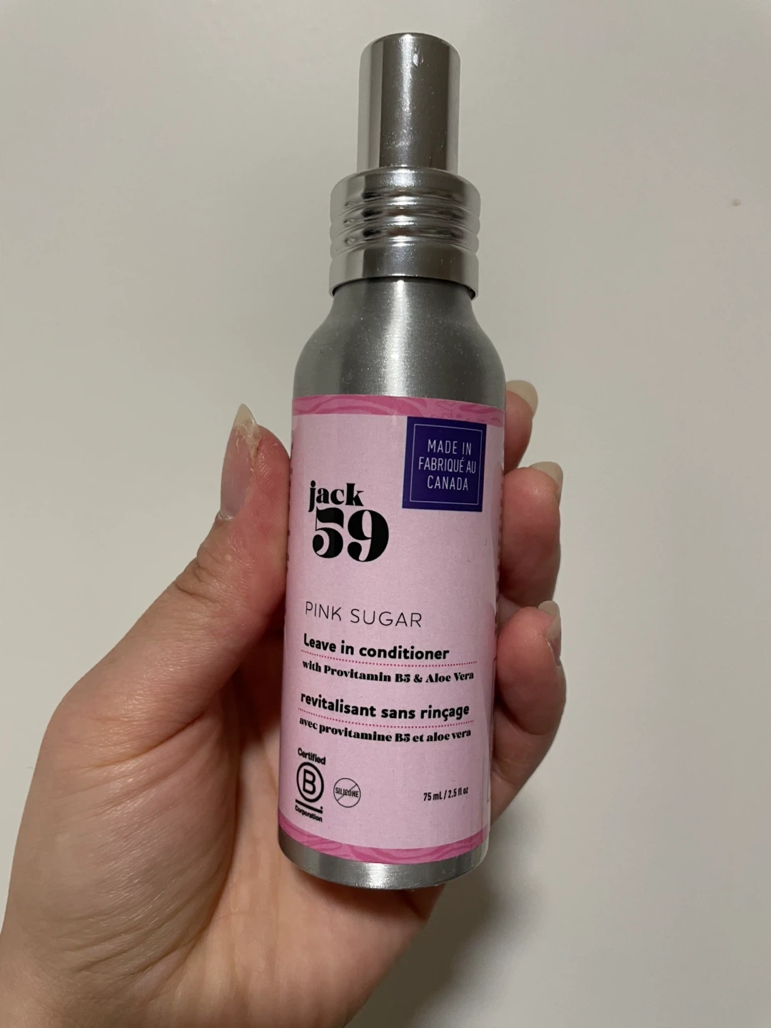 Selling a bottle of Jack 59 Pink Sugar Leave-In Conditioner! It contains ProVitamin B5 and Aloe Vera to help revitalize your hair. The bottle contains 75 mL / 2.5 fl oz of product. Made in Canada!