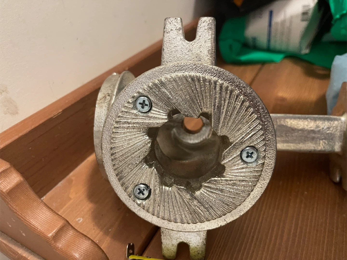 This is a vintage Victoria meat grinder with a hand crank. It's made of metal and includes a clamp to attach to a table. Great for grinding meat or making pasta!