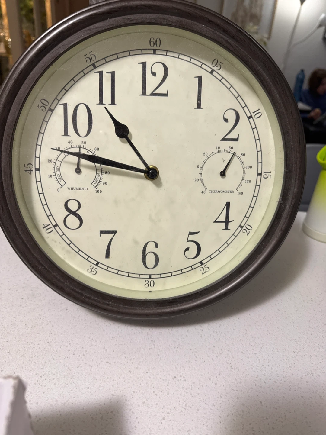 This is a wall clock that also tells you the temperature and humidity! It has a classic design with a brown frame and easy-to-read numbers