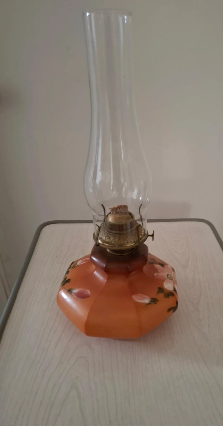 This vintage oil lamp has a hexagonal amber glass base with hand-painted floral details. It features a brass burner with a wick. This lamp would add a classic touch to any room.
