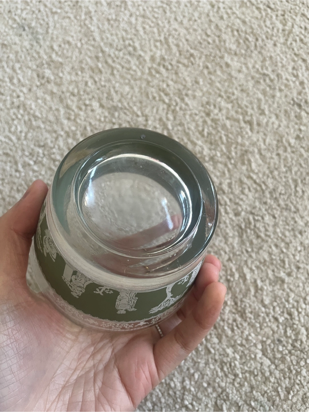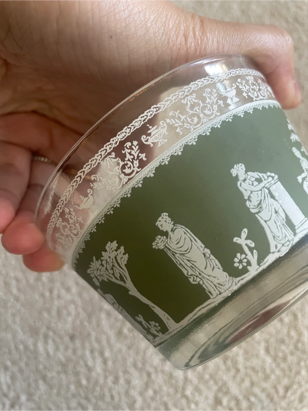 This is a pretty vintage glass bowl with a green band featuring white Grecian-style silhouettes. It's a lovely piece for display or serving. The rim has a delicate white pattern.