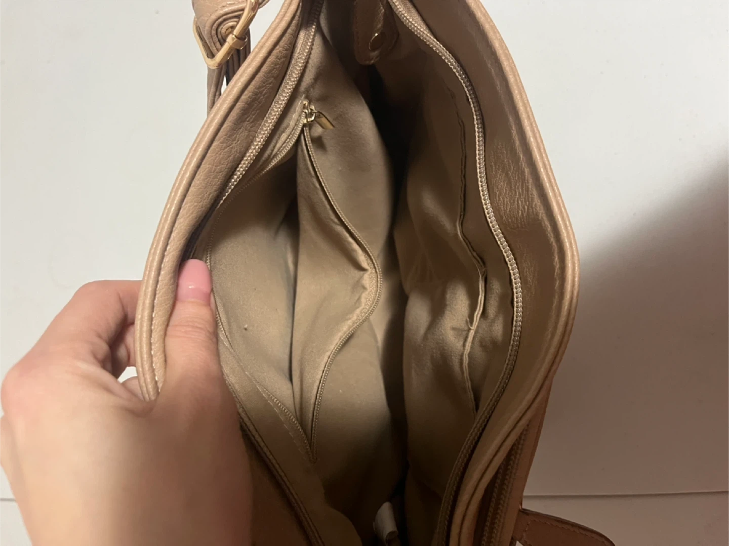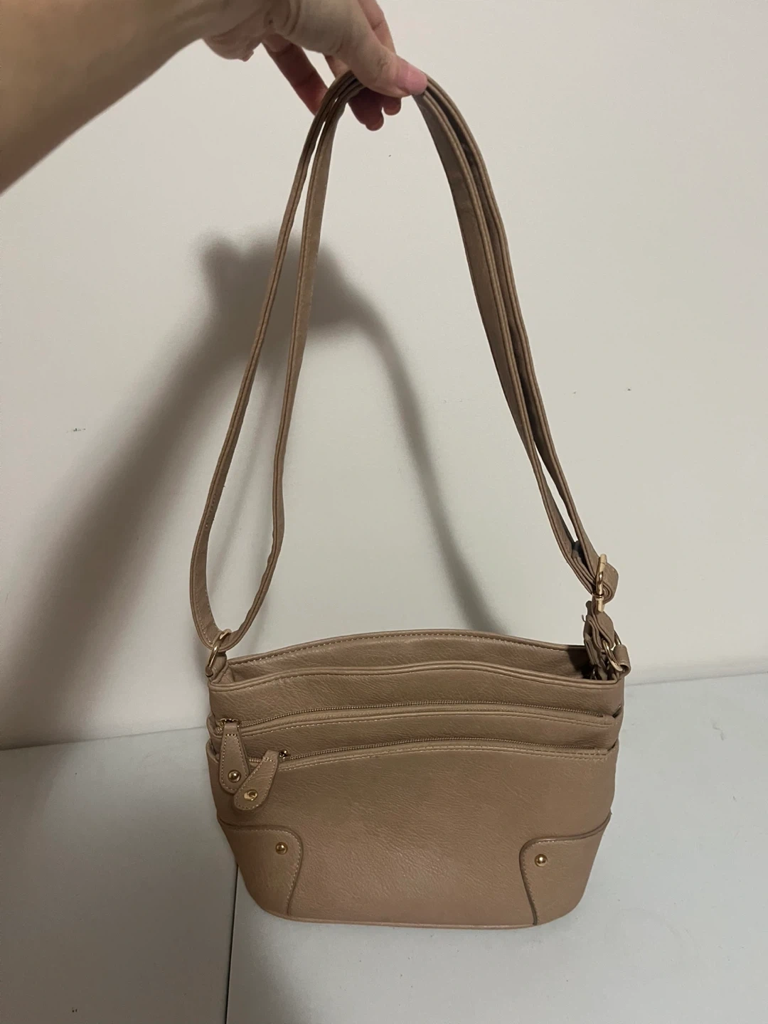 Barely used .. This light brown shoulder bag has multiple zippered compartments. It's made of a faux leather material. It's a great size for everyday use!