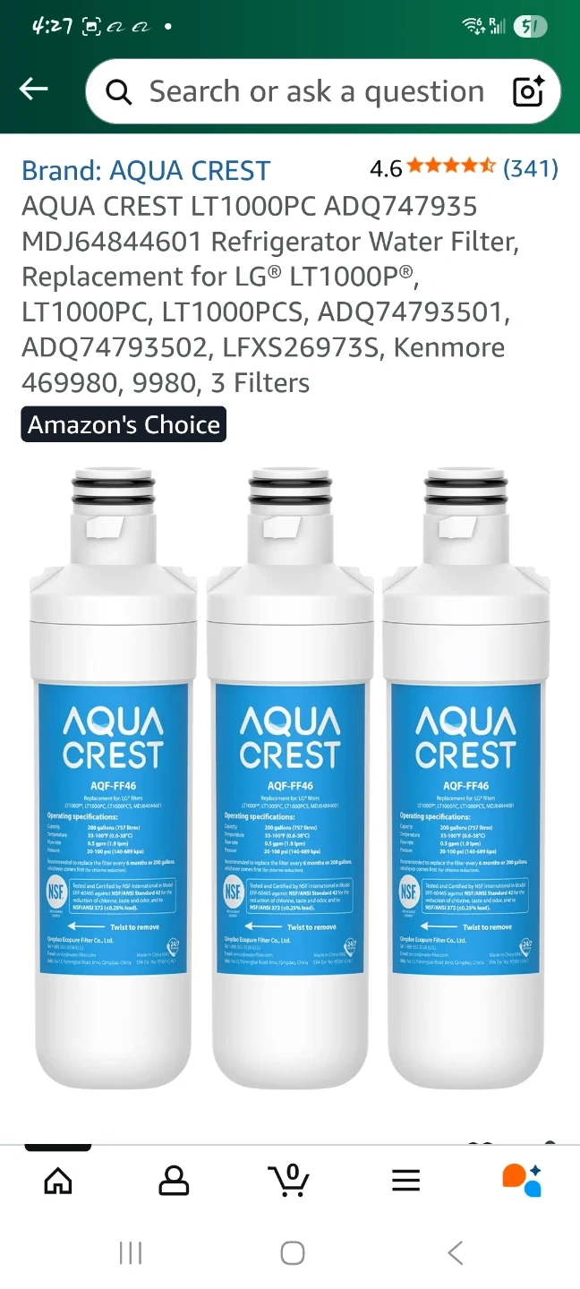 119Selling a set of three AQUA CREST LT1000PC refrigerator water filters, a replacement for LG LT1000P models. These filters are designed to replace the filter every 6 months or after 200 gallons, ensuring you always have fresh, clean water. They are tested and certified by NSF International for the reduction of chlorine, taste, and odor, meeting NSF/ANSI Standard 42.