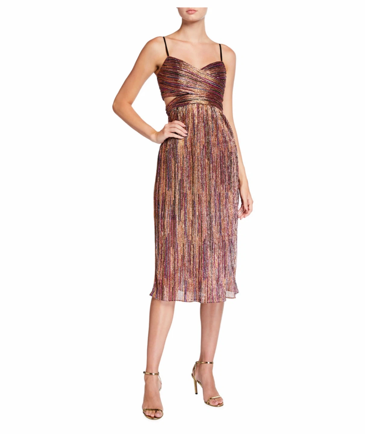 This is a beautiful Aqua brand metallic midi dress. It features a stylish cutout design and a flattering silhouette. Perfect for a night out or special occasion!
