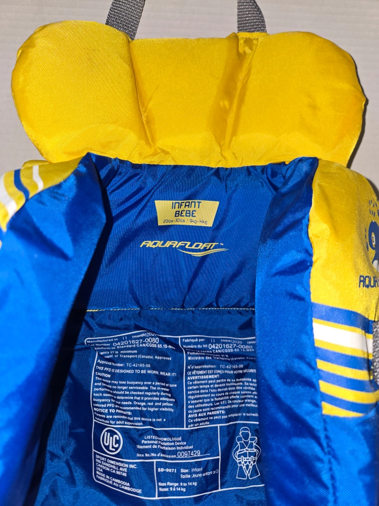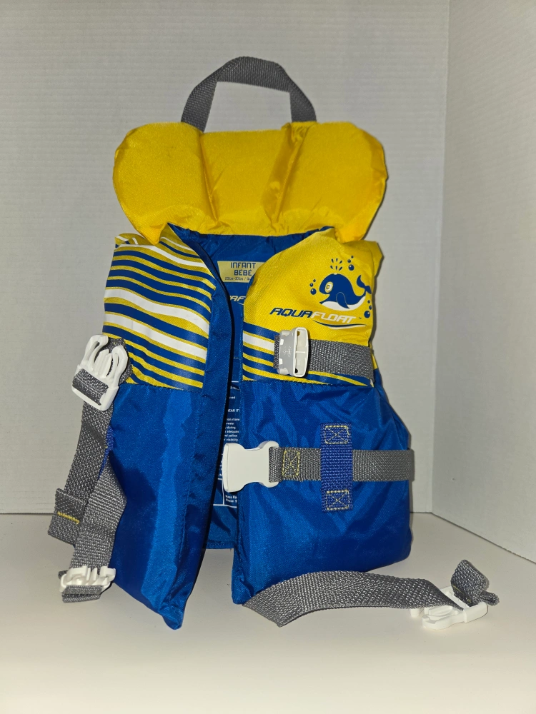 Keep your little one safe in the water with this Aqua Float infant life jacket! It's designed for babies weighing 9 to 14 kg (20 to 30 lbs). This life jacket is in great condition and ready for some summer fun at the pool or lake