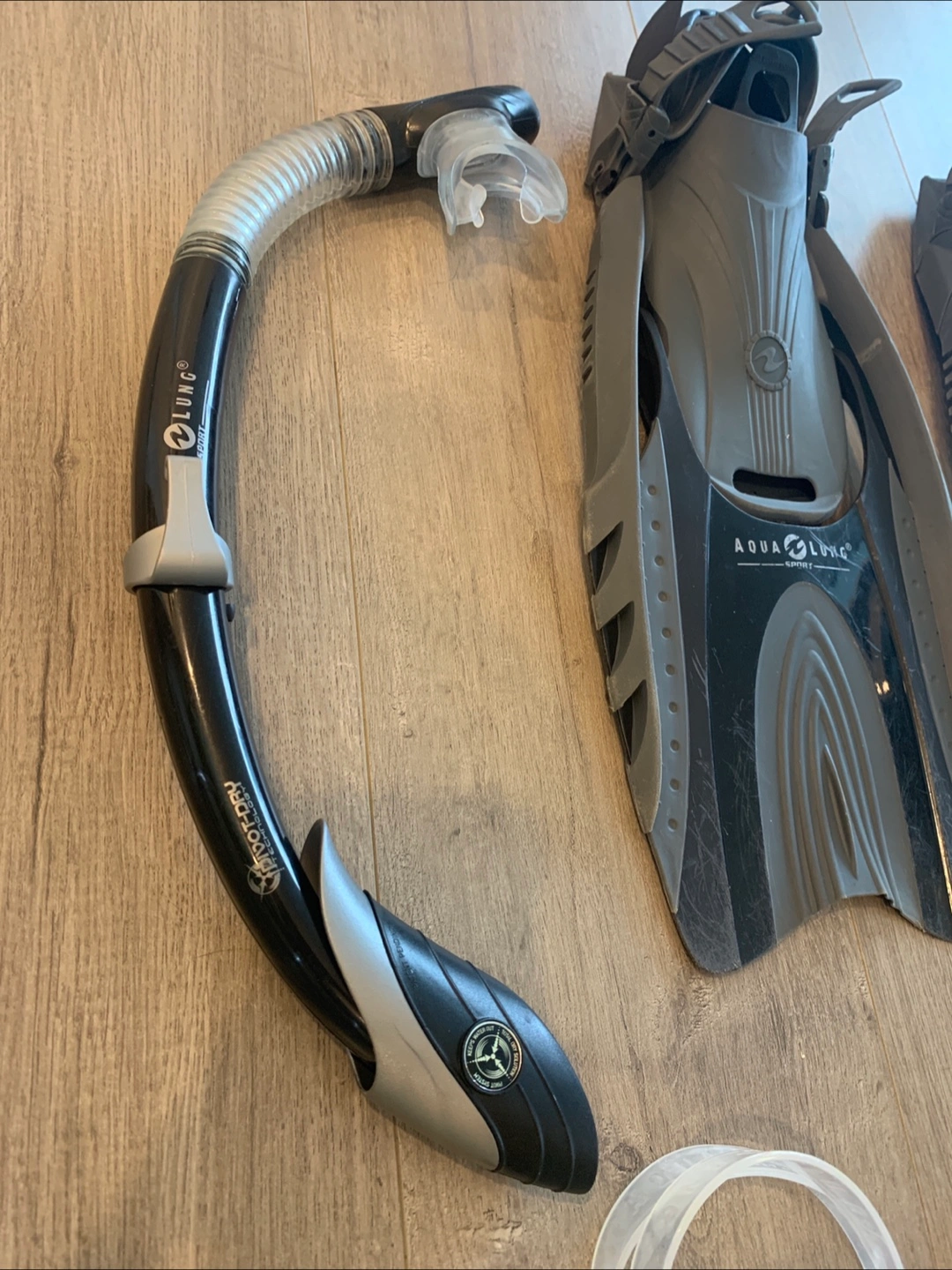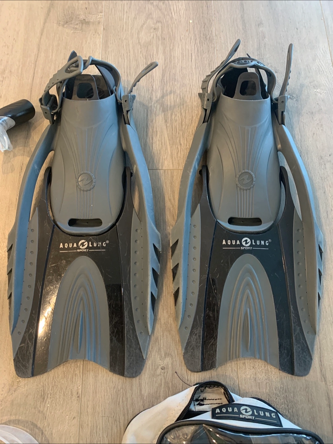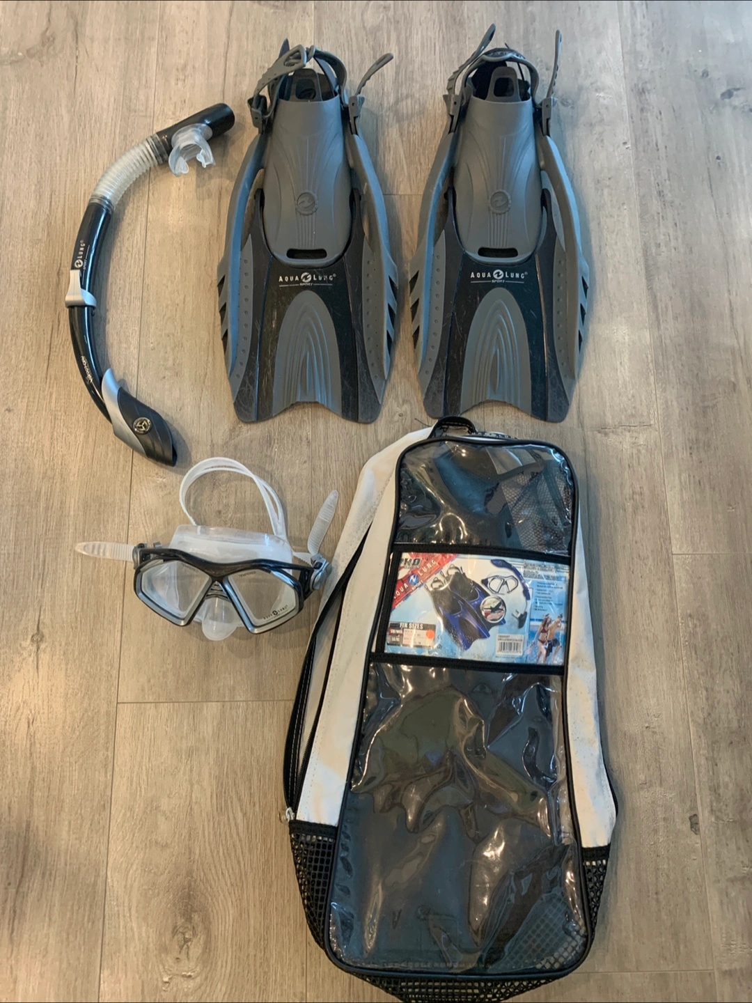 Get ready for your next underwater adventure with this Aqua Lung snorkeling set! Includes a mask tempered, fins, and a snorkel. Everything you need to explore the depths! Has been in storage for about a year and not needed any longer. size s/ m see pictures