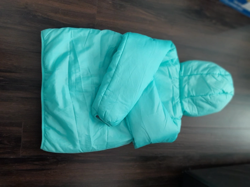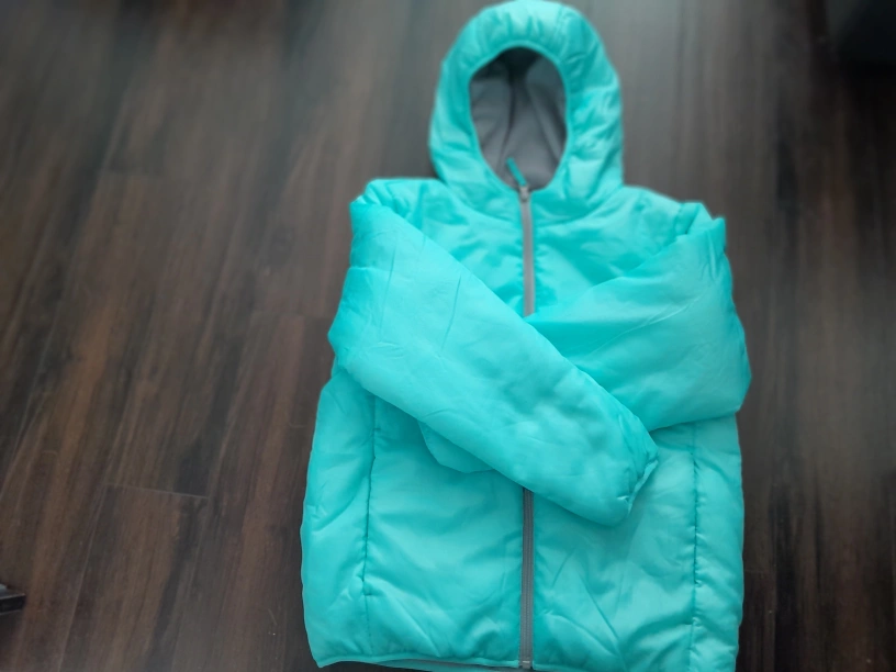Here's an aqua-coloured puffer jacket! It's in great condition and ready to keep you warm. It's a stylish choice for those cooler days