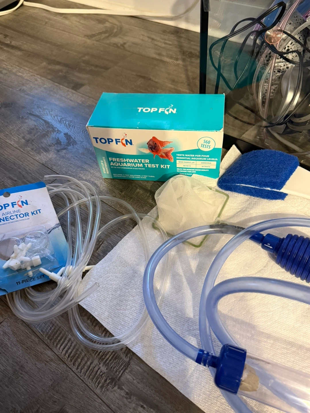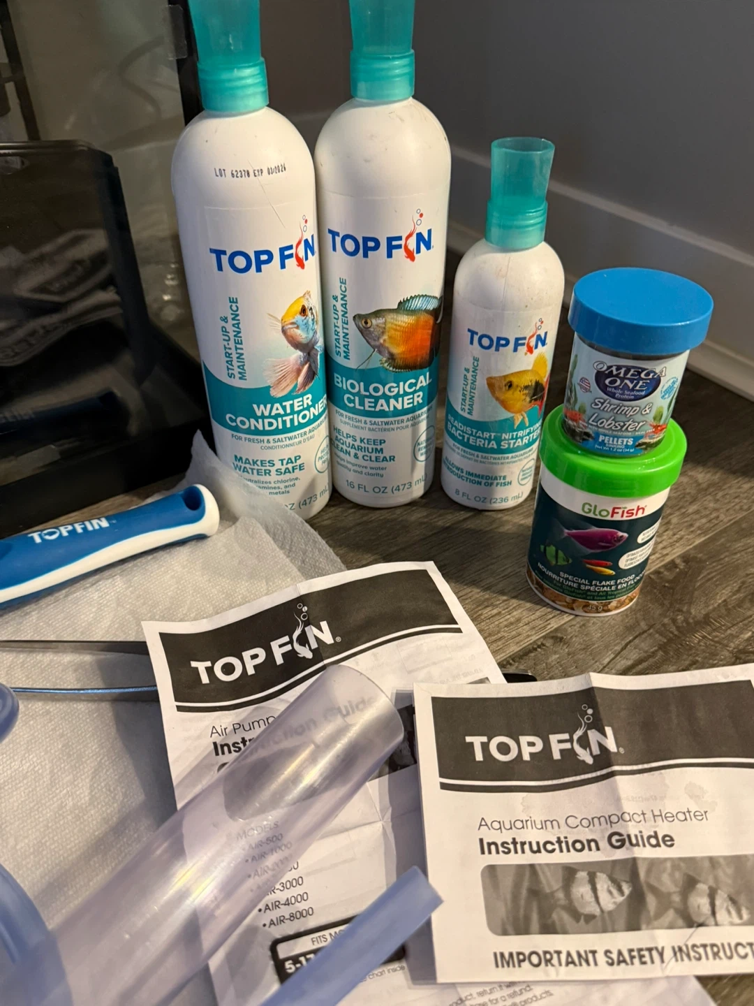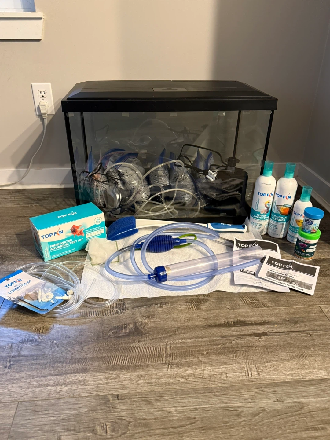 10Selling 20 gallon fish tank and a variety of aquarium supplies! Includes: - Freshwater Aquarium Test Kit (560 tests) - Airline Connector Kit (11-piece set) - Water Conditioner - Biological Cleaner - Bacteria Starter - Omega One Shrimp & Lobster Bites - GloFish Special Flake Food - Aquarium Compact Heater (preset at 78 degrees) - Air Pump - Instructions and guides included -black gravel (cleaned) -gravel cleaner/water changer