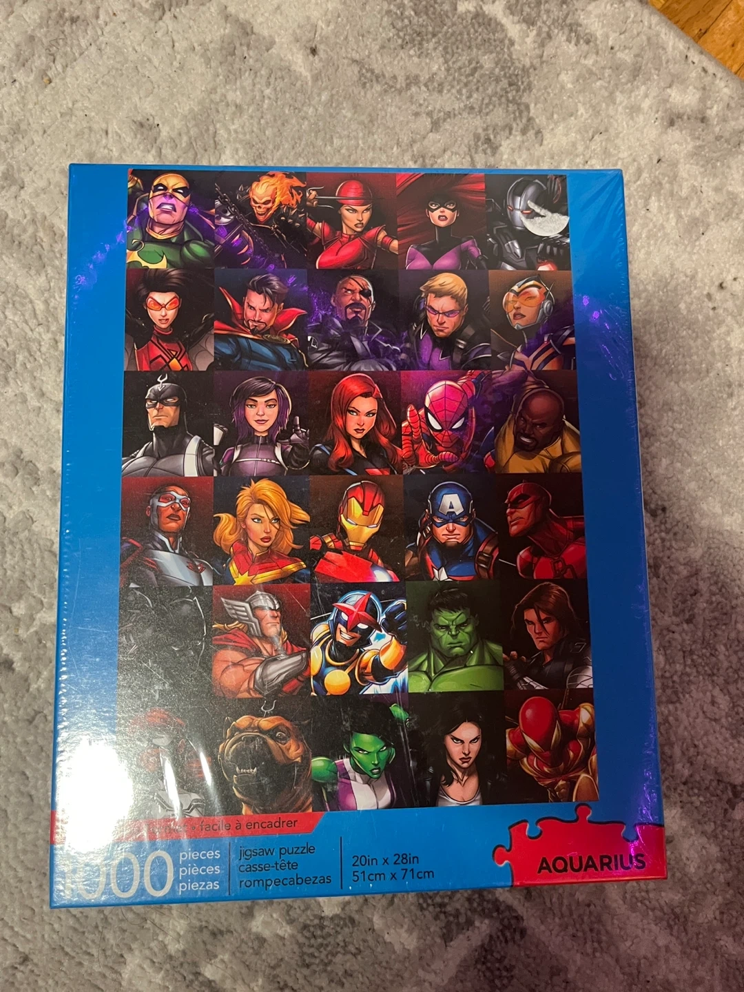 Selling a brand new, sealed Aquarius Marvel 1000 piece jigsaw puzzle! The finished puzzle is 20in x 28in (51cm x 71cm). It's ready for some puzzling fun!