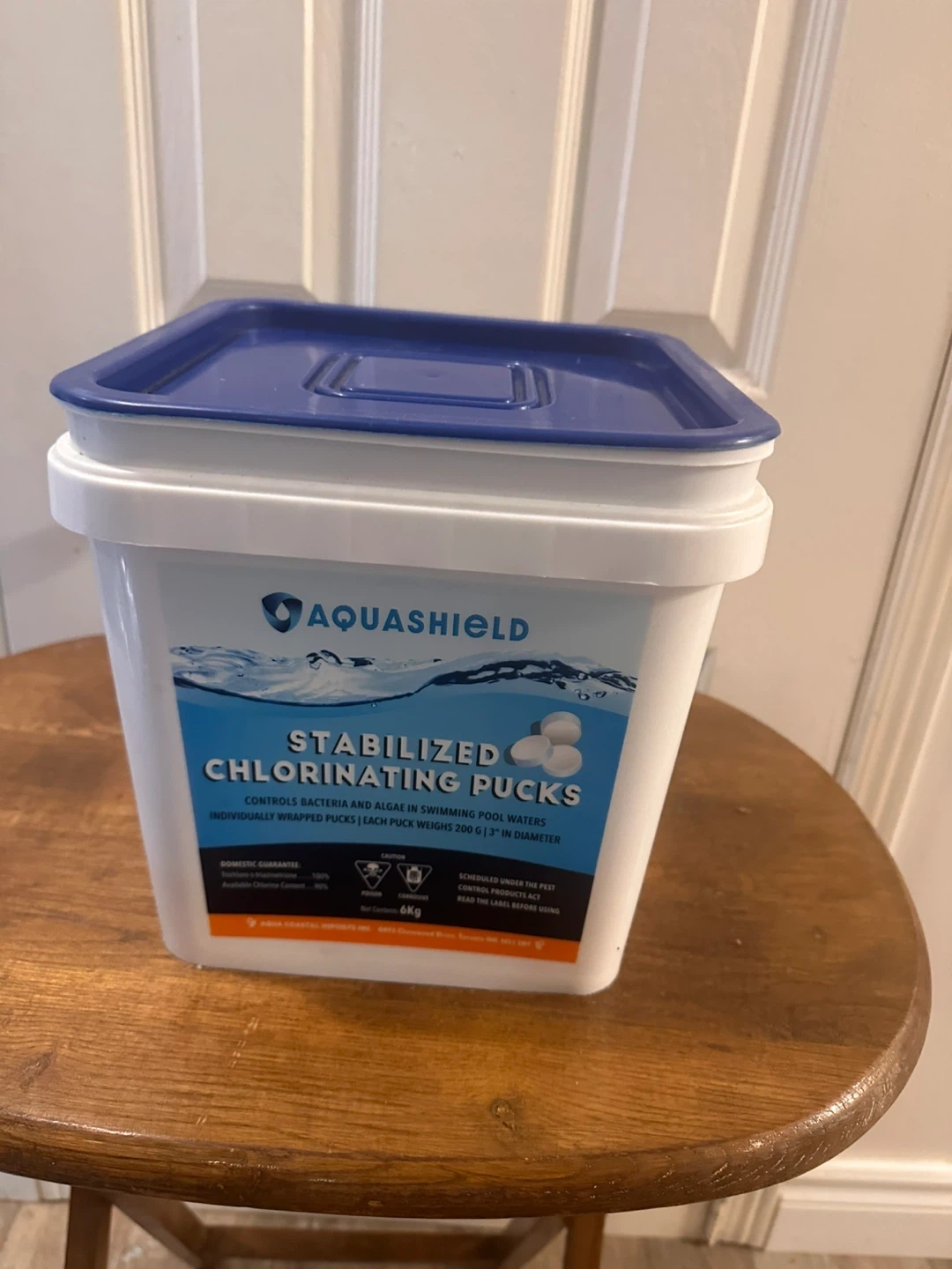 Selling a 6kg container of Aquashield stabilized chlorinating pucks! These pucks control bacteria and algae in pool water. Each puck weighs 200g and is 3" in diameter