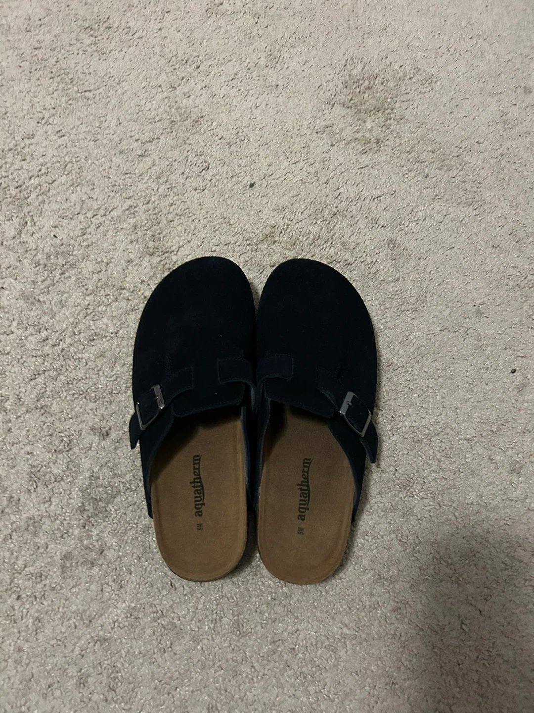 These Aquatherm clogs are super comfy and stylish! They're a classic black suede with adjustable buckle straps for a perfect fit. Great for wearing around the house or quick errands