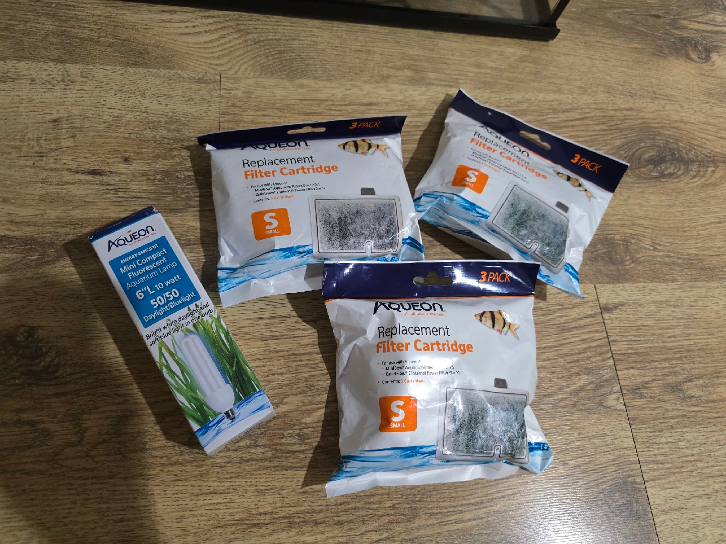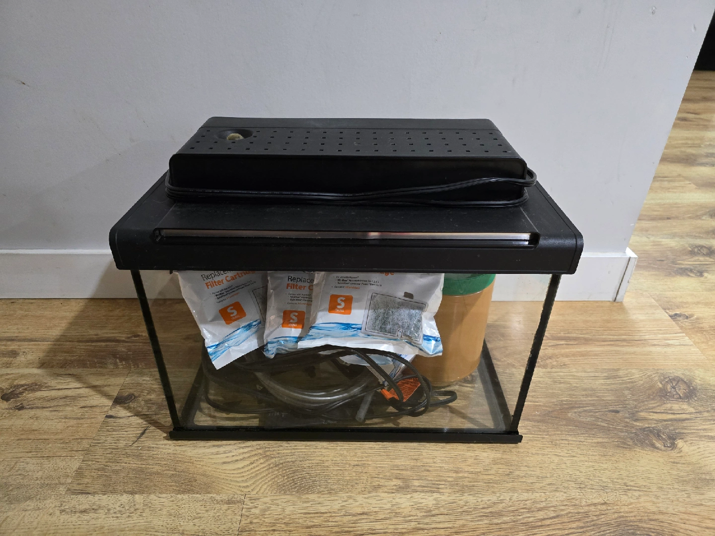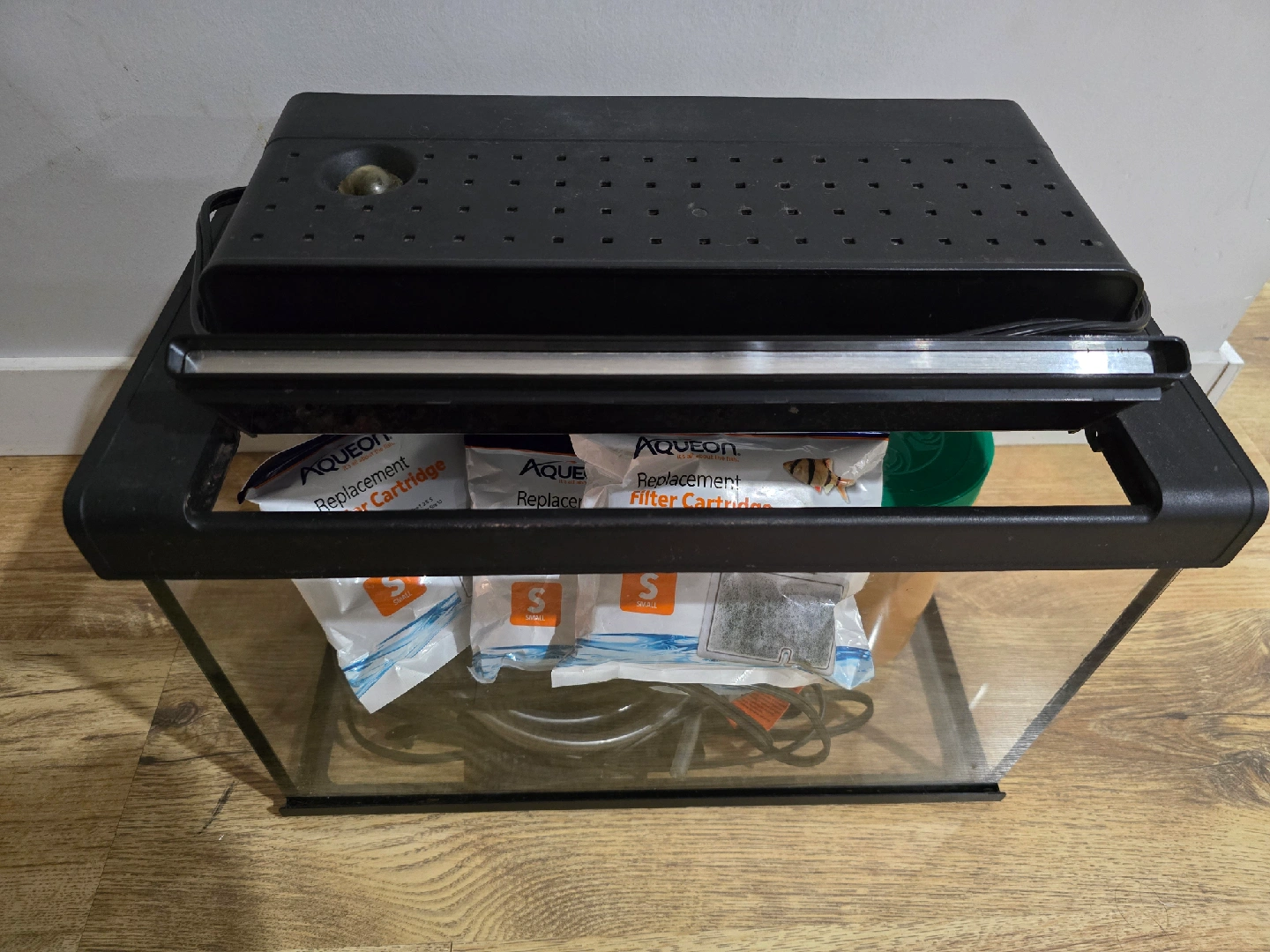 Selling an Aqueon 5 gallon aquarium. It comes with everything you need to get started! Included are: - Aqueon Replacement Filter Cartridges (Small) - Top Fin filter - Aqueon Mini-Compact Fluorescent Aquarium Lamp (6" L, 10 watt, 50/50 Daylight/Blue Light) - Gravel - Water Warmer